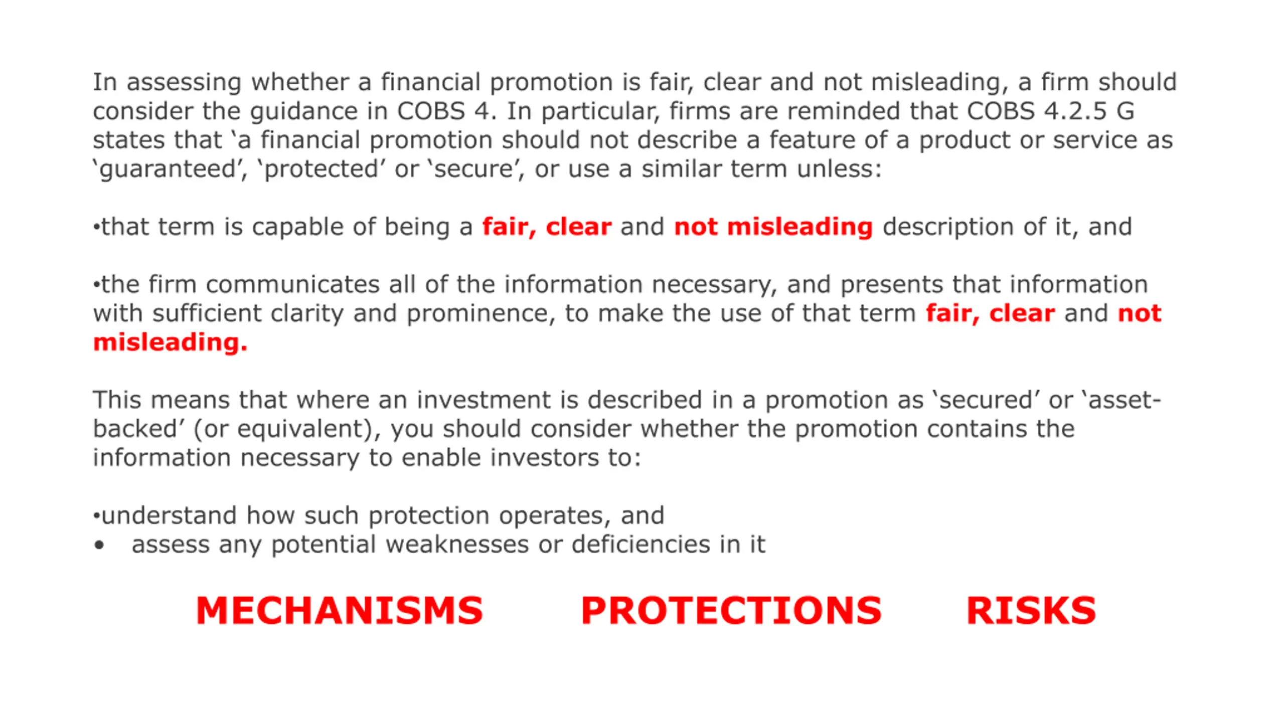 In assessing whether a financial promotion is fair, clear and not misleading, a firm should consider the guidance in COBS 4. In particular, firms are reminded that COBS 4.2.5 G states that a financial promotion should not describe a feature of a product or service as guaranteed , protected or secure , or use a similar term unless: that term is capable of being a fair, clear and not misleading description of it, and the firm communicates all of the information necessary, and presents that information with sufficient clarity and prominence, to make the use of that term fair, clear and not misleading. This means that where an investment is described in a promotion as secured or asset- backed (or equivalent), you should consider whether the promotion contains the information necessary to enable investors to: understand how such protection operates, and assess any potential weaknesses or deficiencies in it MECHANISMS PROTECTIONS RISKS