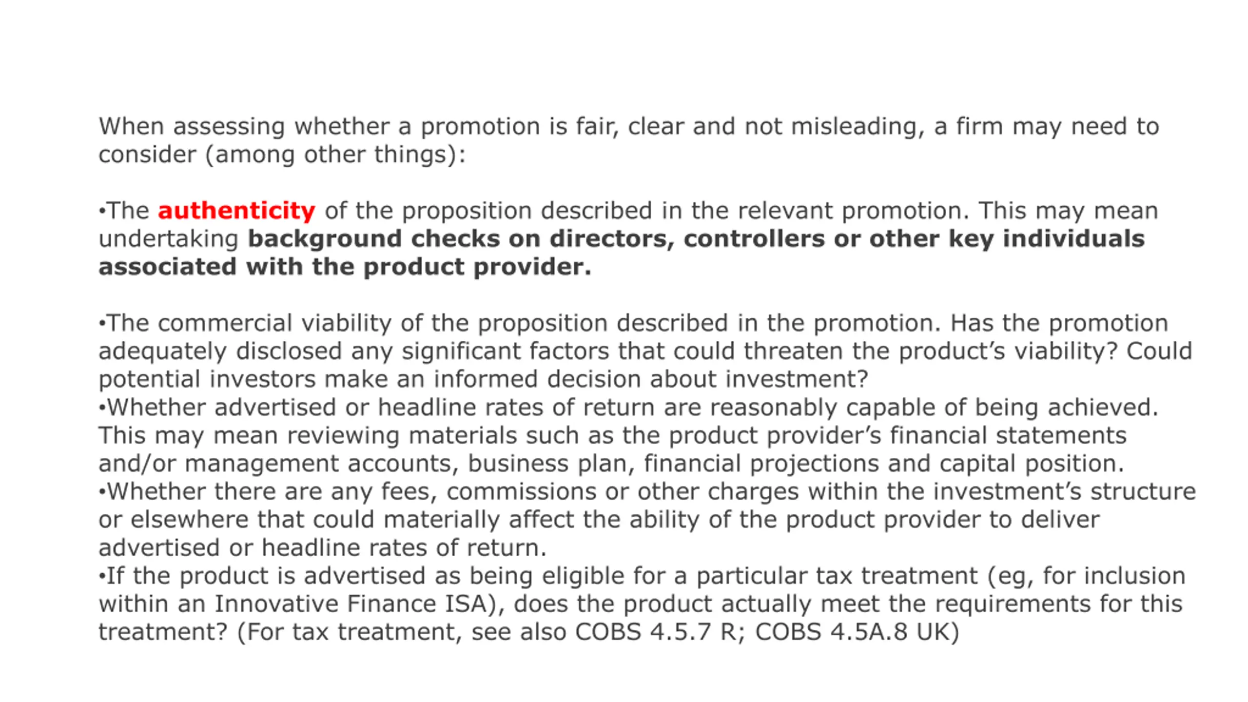 When assessing whether a promotion is fair, clear and not misleading, a firm may need to consider (among other things): The authenticity of the proposition described in the relevant promotion. This may mean undertaking background checks on directors, controllers or other key individuals associated with the product provider. The commercial viability of the proposition described in the promotion. Has the promotion adequately disclosed any significant factors that could threaten the product s viability? Could potential investors make an informed decision about investment? Whether advertised or headline rates of return are reasonably capable of being achieved. This may mean reviewing materials such as the product provider s financial statements and/or management accounts, business plan, financial projections and capital position. Whether there are any fees, commissions or other charges within the investment s structure or elsewhere that could materially affect the ability of the product provider to deliver advertised or headline rates of return. If the product is advertised as being eligible for a particular tax treatment (eg, for inclusion within an Innovative Finance ISA), does the product actually meet the requirements for this treatment? (For tax treatment, see also COBS 4.5.7 R; COBS 4.5A.8 UK)