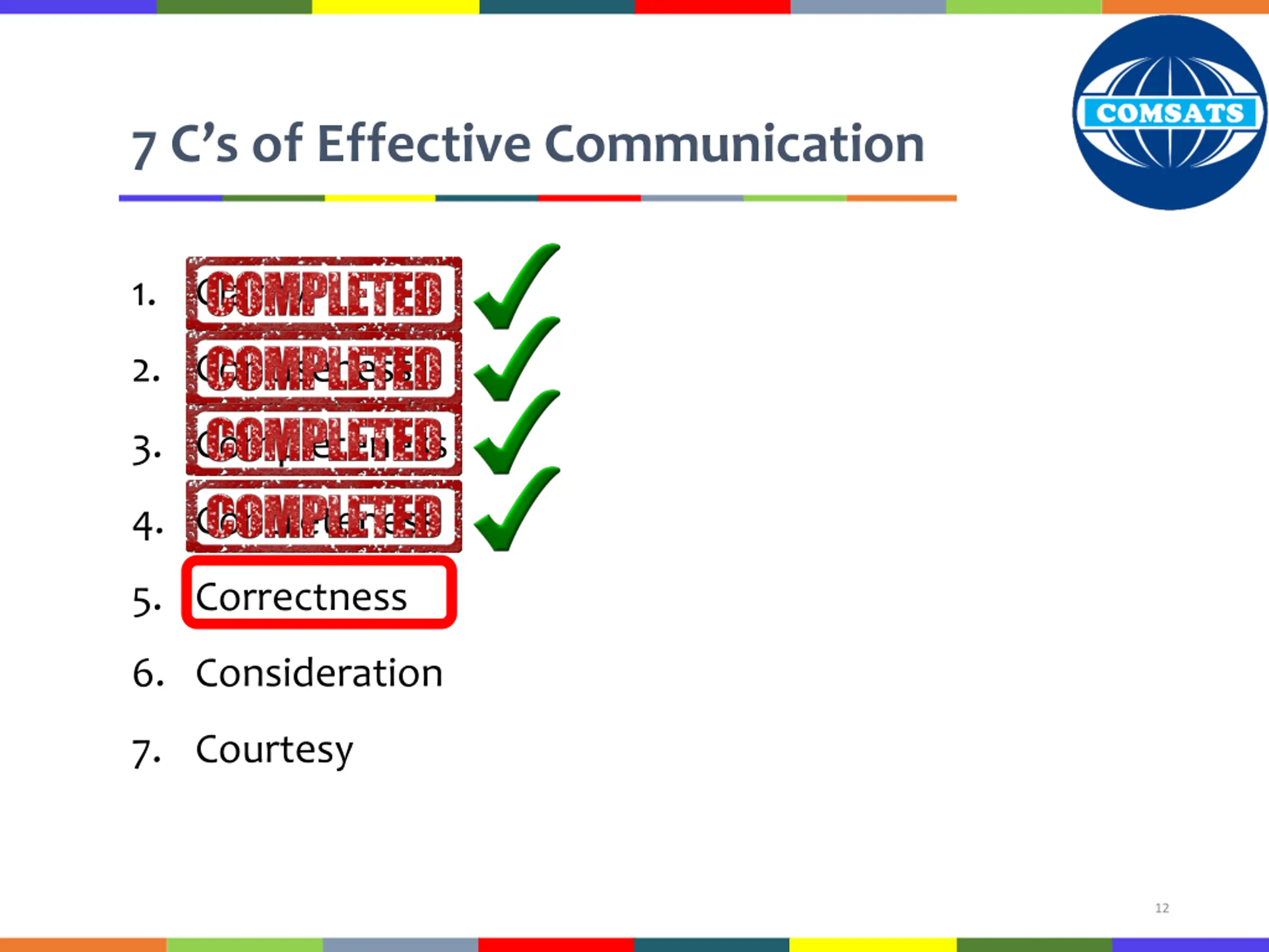 7 Cs of Effective Communication 1. Clarity 2. Conciseness 3. Completeness 4. Concreteness 5. Correctness 6. Consideration 7. Courtesy 12