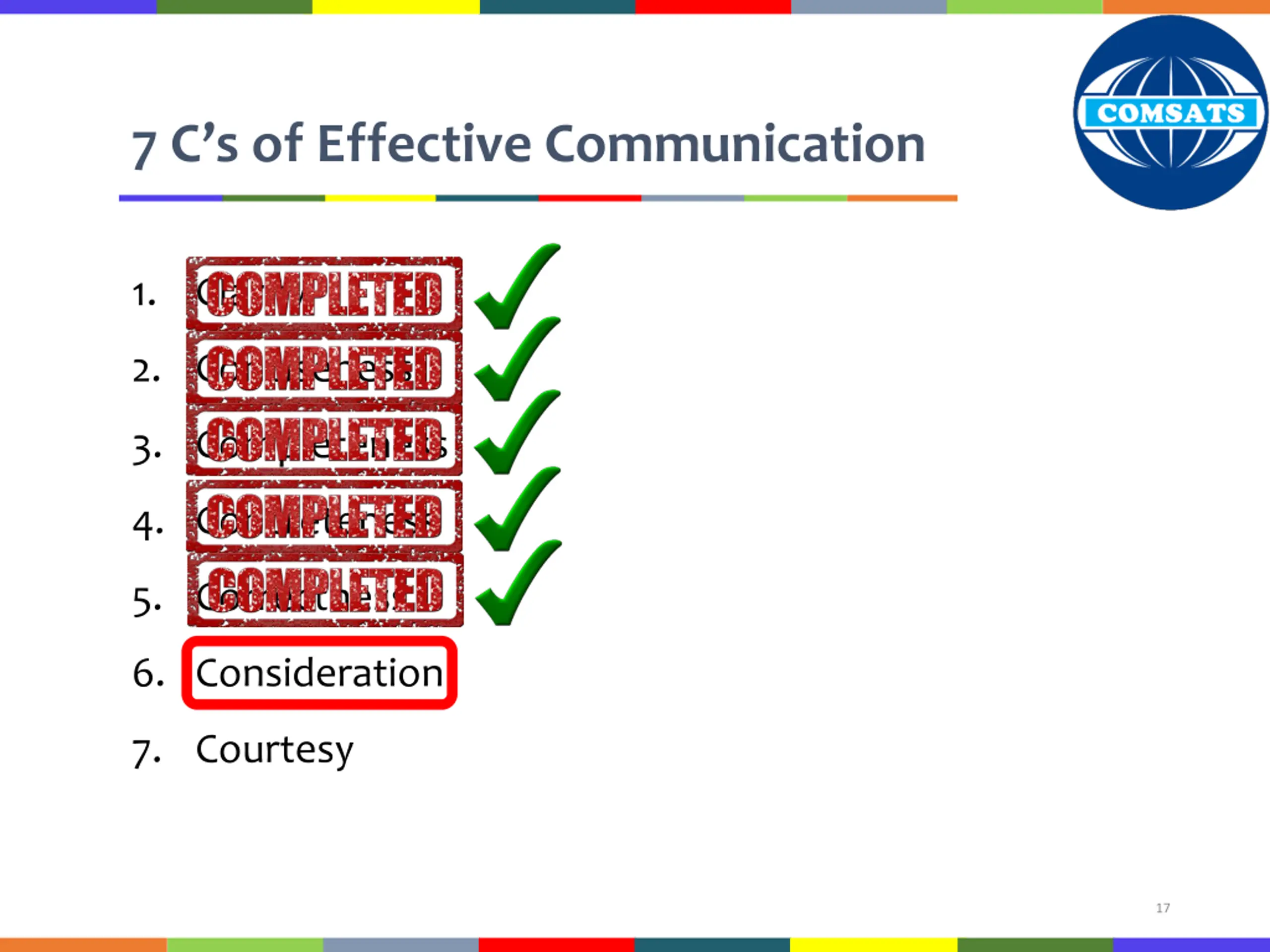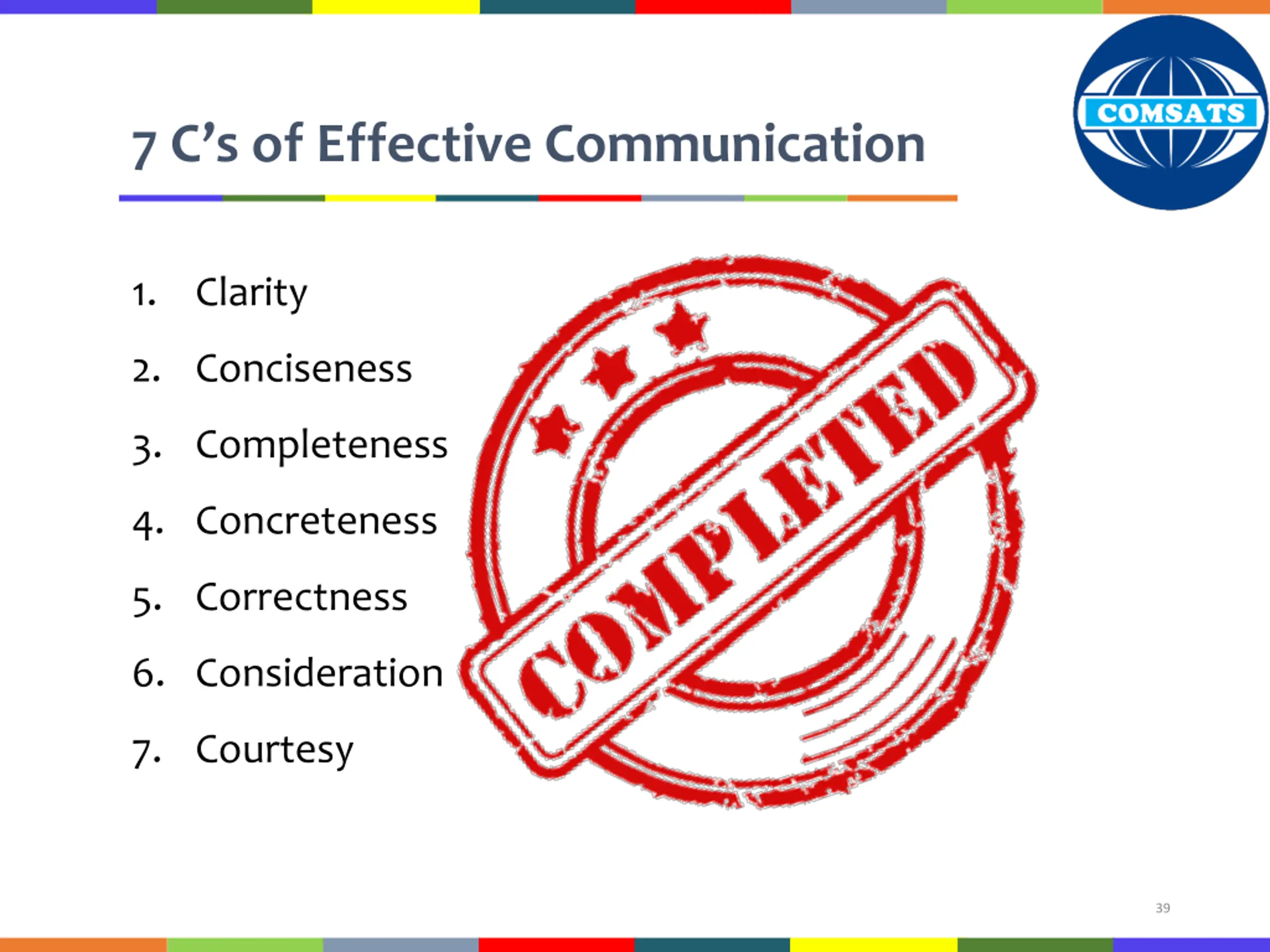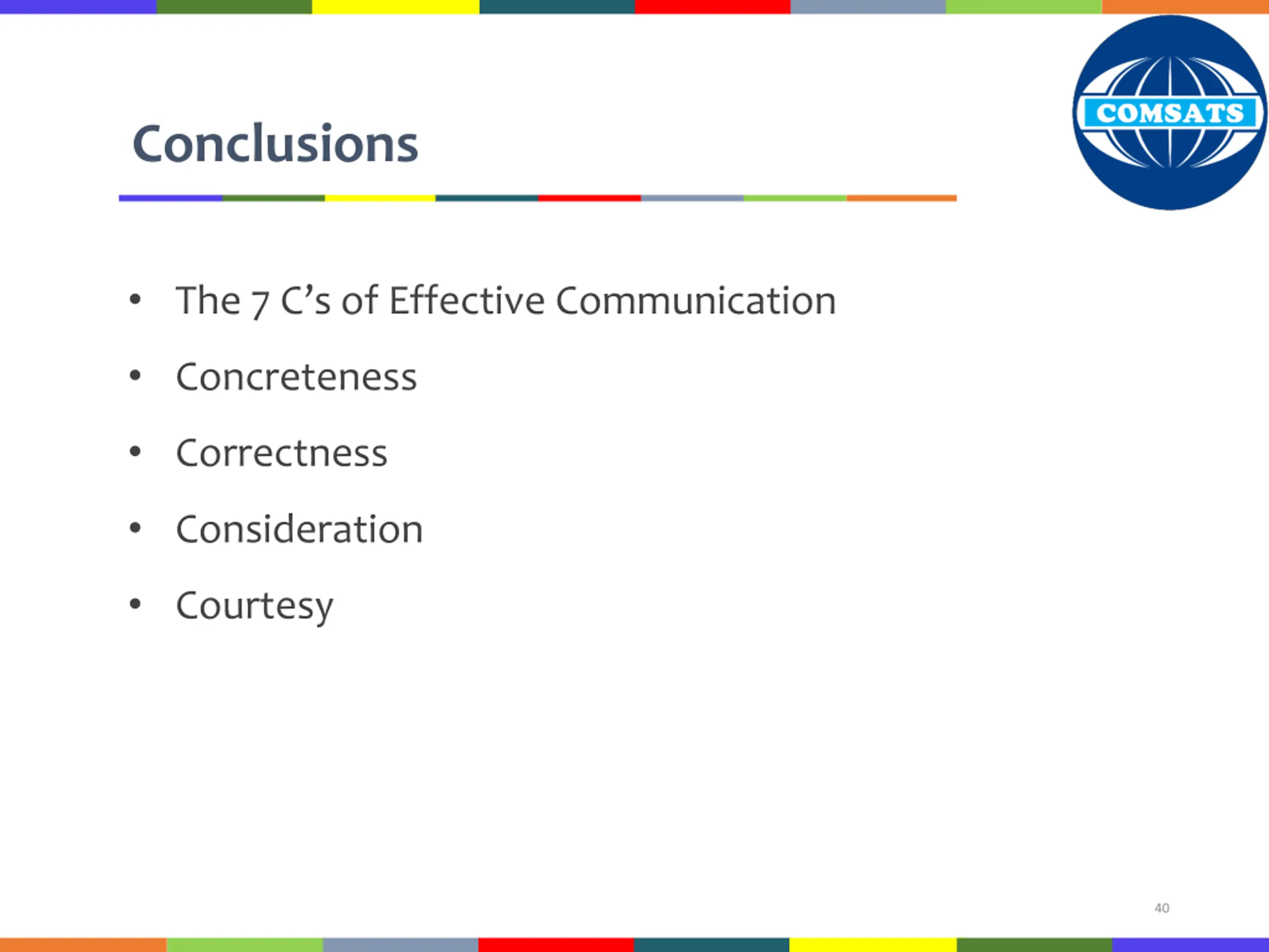 Conclusions The 7 C s of Effective Communication Concreteness Correctness Consideration Courtesy 40