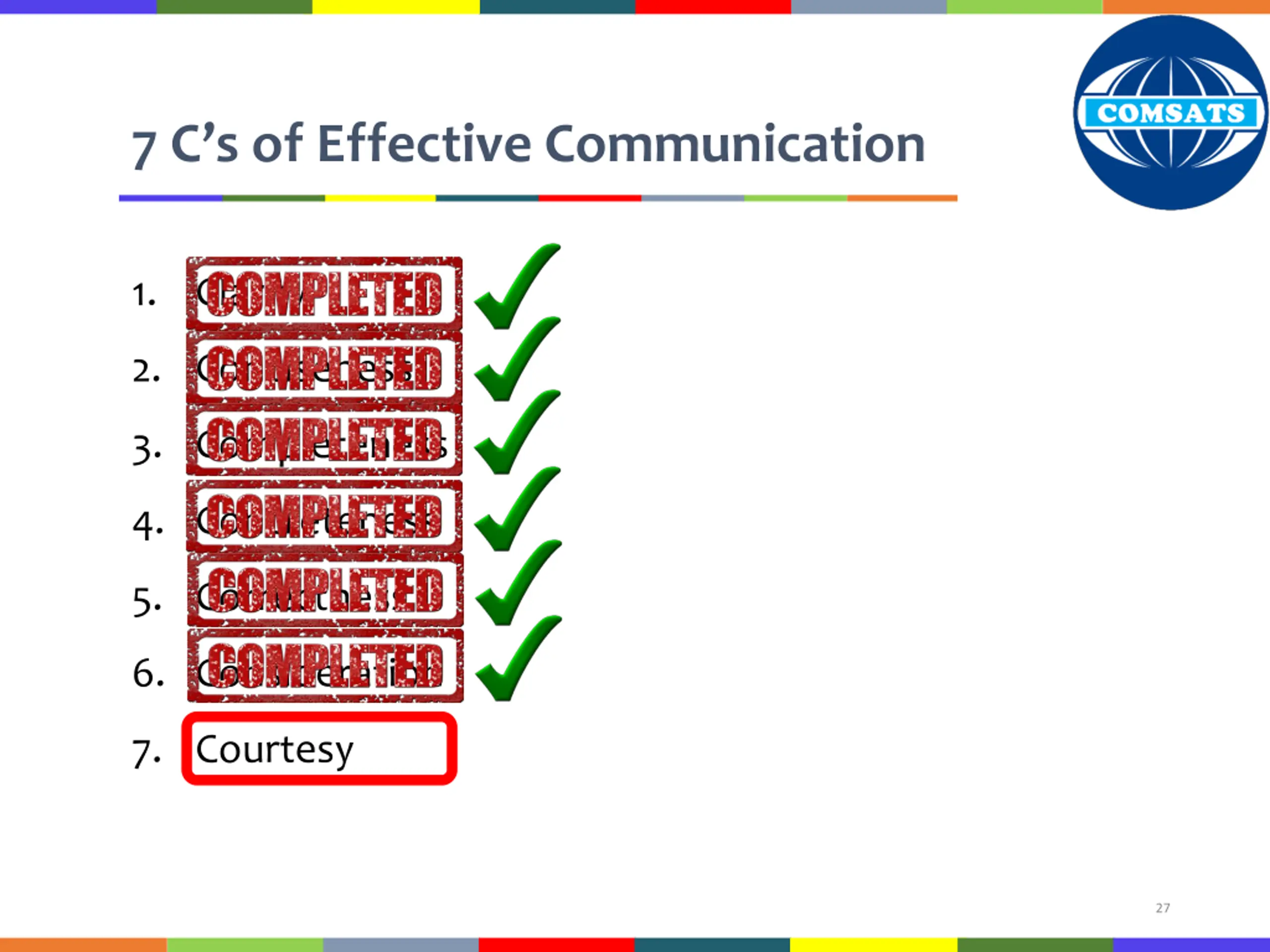 7 Cs of Effective Communication 1. Clarity 2. Conciseness 3. Completeness 4. Concreteness 5. Correctness 6. Consideration 7. Courtesy 27