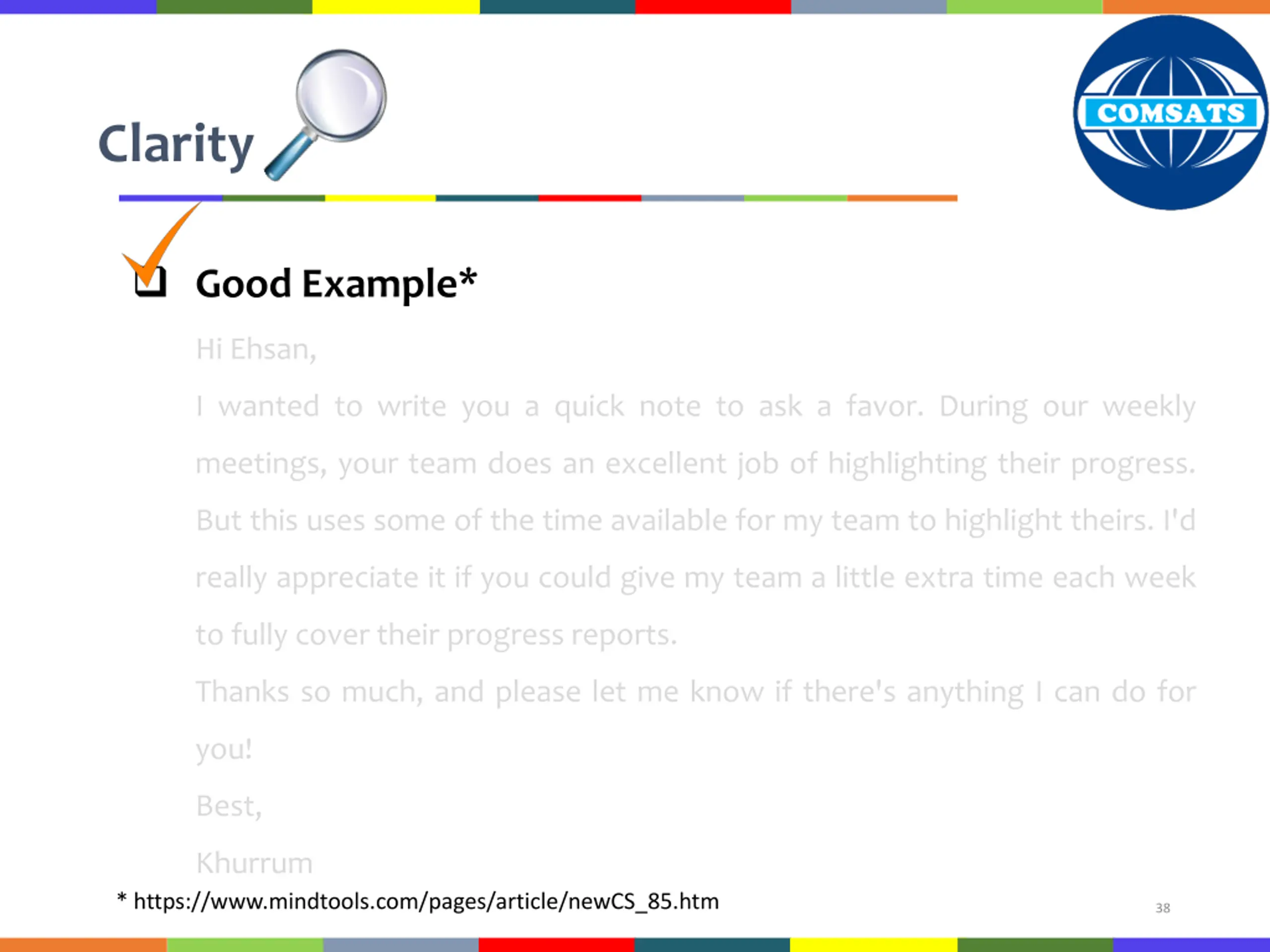 Clarity Bad Example* Ehsan, I wanted to let you know that I don't appreciate how your team always monopolizes the discussion at our weekly meetings. I have a lot of projects, and I really need time to get my team's progress discussed as well. So far, thanks to your department, I haven't been able to do that. Can you make sure they make time for me and my team next week? Thanks, Khurrum * https://www.mindtools.com/pages/article/newCS_85.htm 37