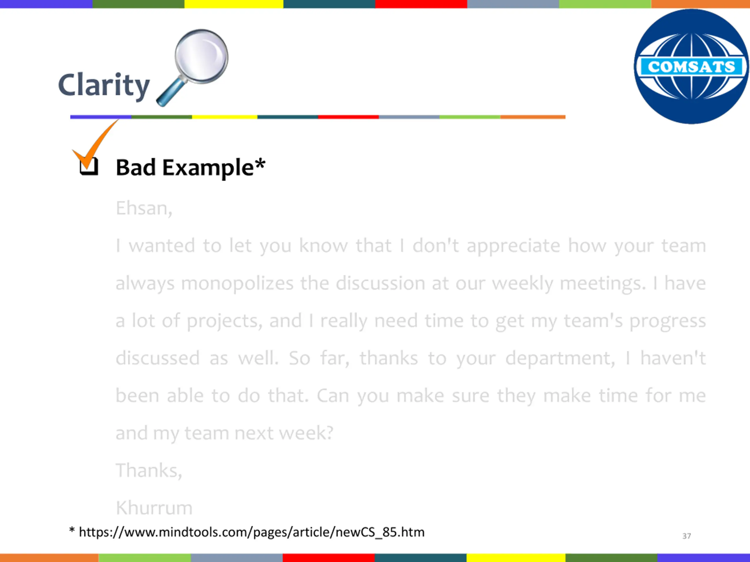 Courtesy Good Example* Hi Ali, I understand that the IT team is swamped with work and gets requests from every department in the organization. My team, however, is working on a high-priority project and I would greatly appreciate if you could ask your team members to respond to my team s queries promptly and help us complete this project on time. Please do let me know if you need anything from me. Regards Muzammil * https://www.invensislearning.com/blog/7-rules-of-effective-communication-with-examples/ 36