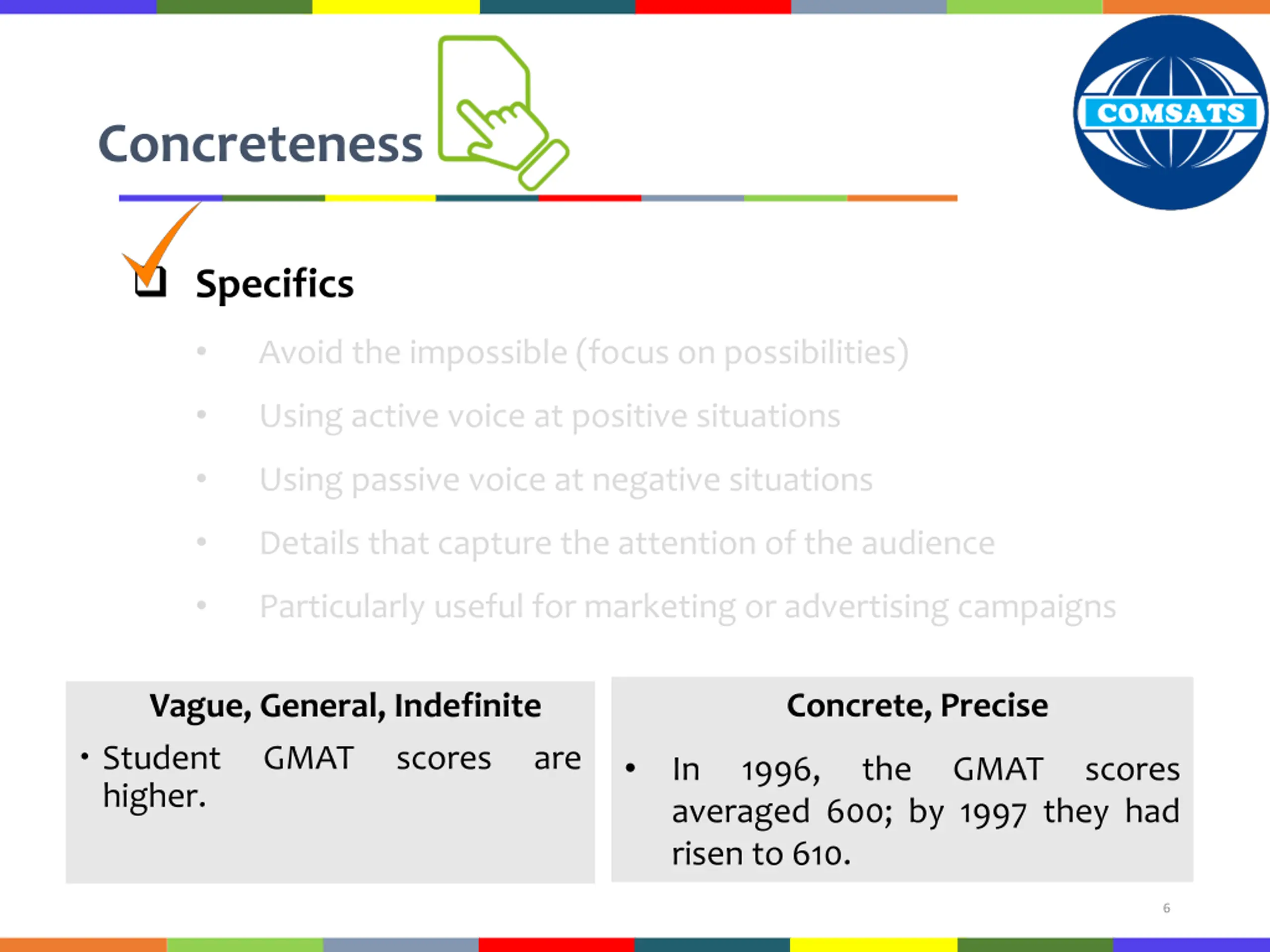Concreteness Specifics Avoid the impossible (focus on possibilities) Using active voice at positive situations Using passive voice at negative situations Details that capture the attention of the audience Particularly useful for marketing or advertising campaigns Concrete, Precise Vague, General, Indefinite Student GMAT higher. scores are In averaged 600; by 1997 they had risen to 610. 1996, the GMAT scores 6