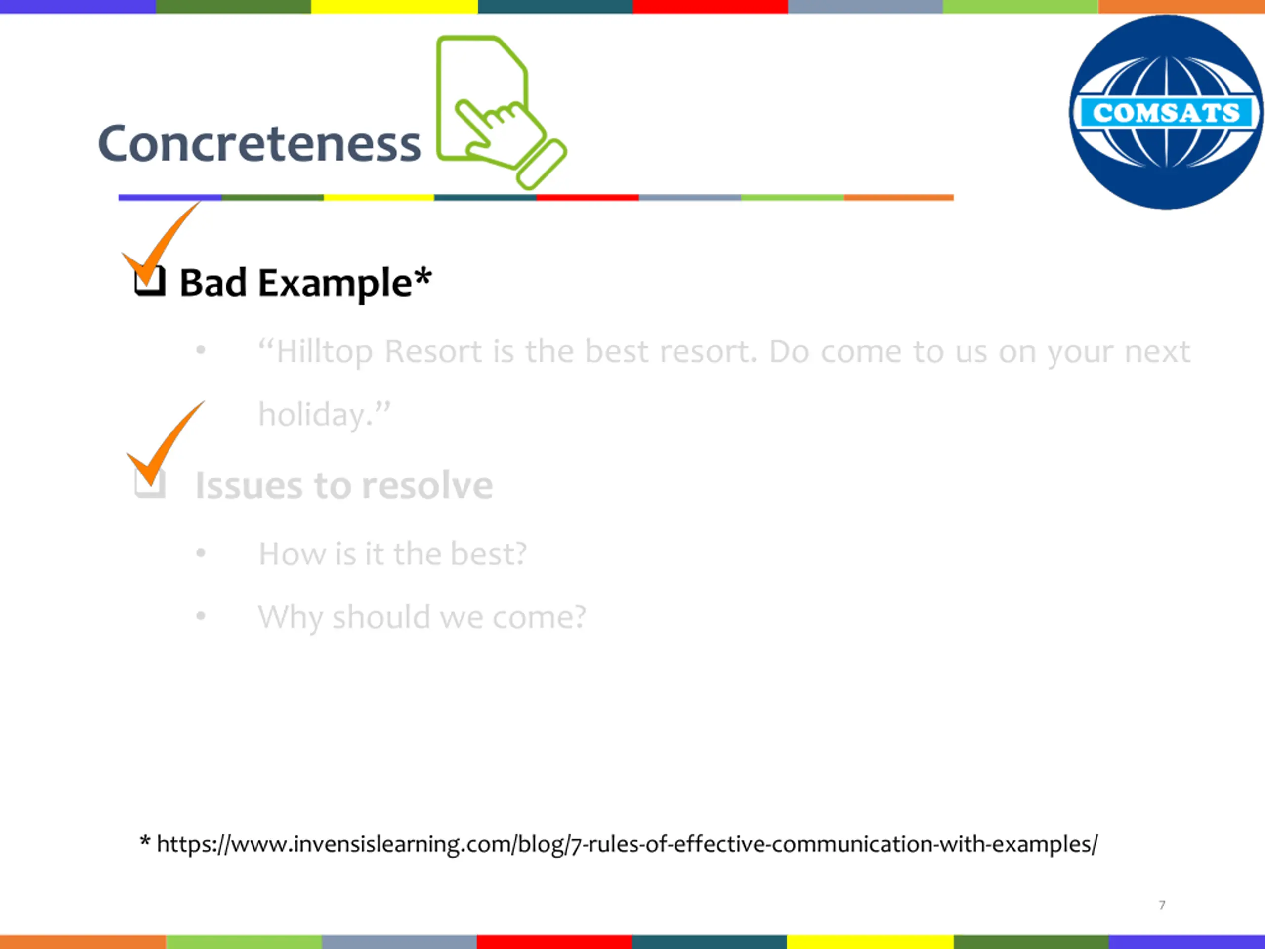 Concreteness Bad Example* Hilltop Resort is the best resort. Do come to us on your next holiday. Issues to resolve How is it the best? Why should we come? * https://www.invensislearning.com/blog/7-rules-of-effective-communication-with-examples/ 7