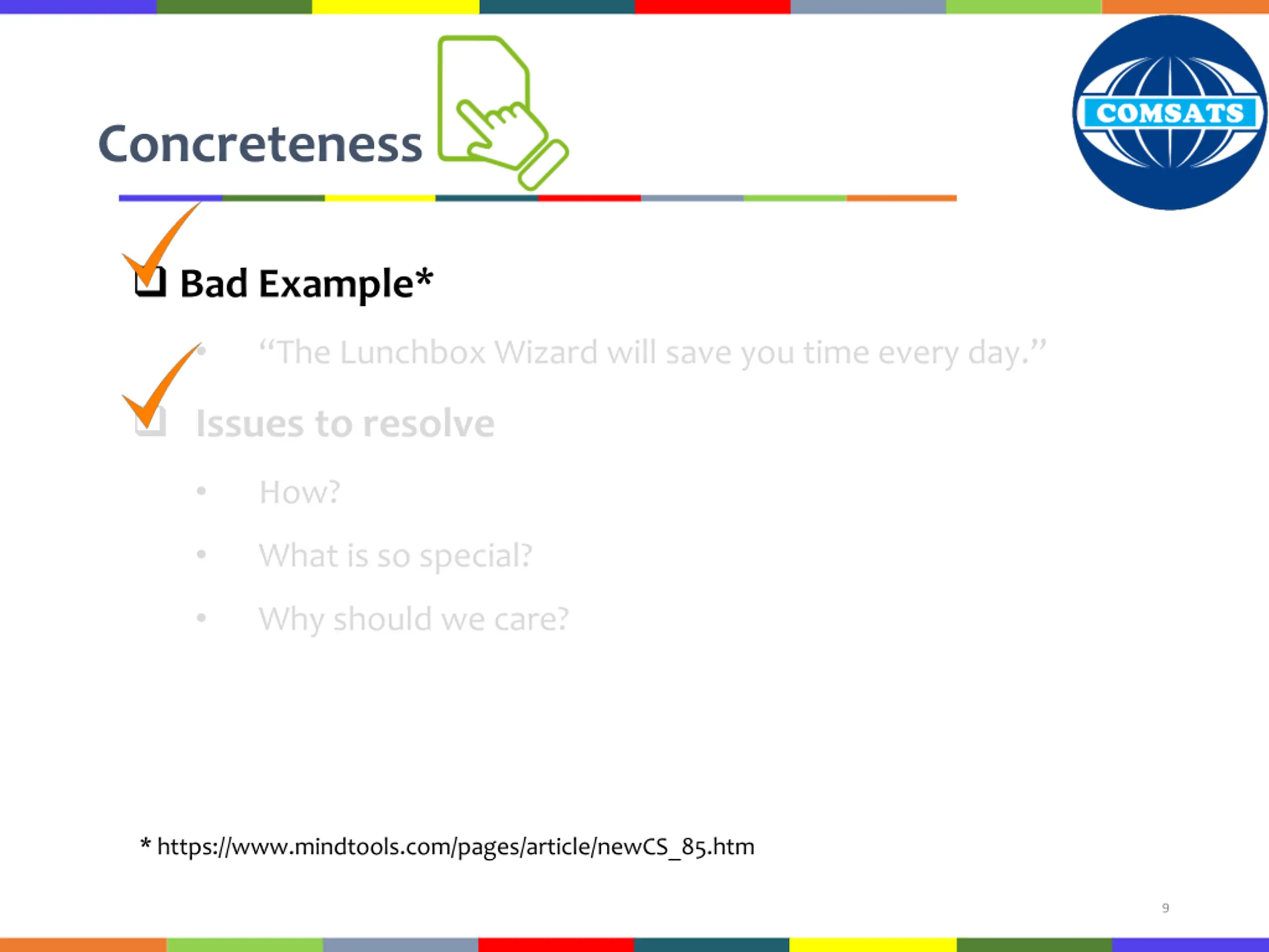 Concreteness Good Example* Hilltop Resort is the jewel of the western hills. Take a break from your work. Escape from life s chaos and stress. Relax and rejuvenate yourself at Hilltop. Go back fresh and energized! Tips Visualizing details Comparison being provided between two situations * https://www.invensislearning.com/blog/7-rules-of-effective-communication-with-examples/ 8