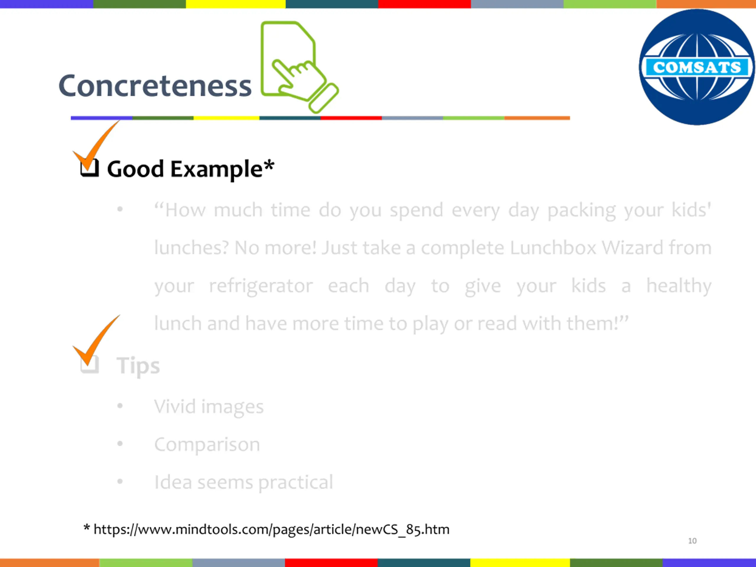 Concreteness Bad Example* The Lunchbox Wizard will save you time every day. Issues to resolve How? What is so special? Why should we care? * https://www.mindtools.com/pages/article/newCS_85.htm 9