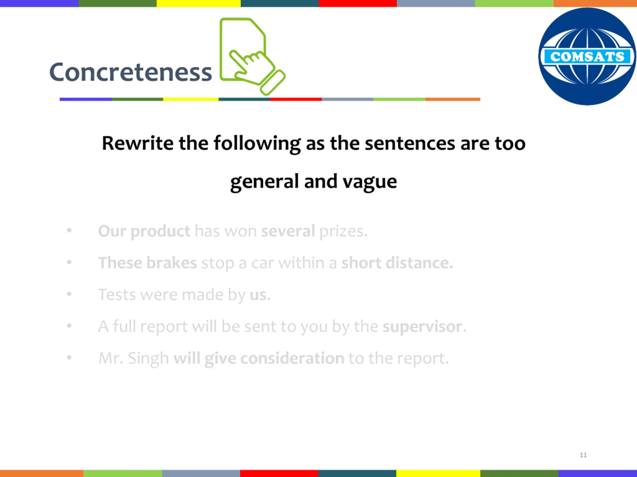 Concreteness Rewrite the following as the sentences are too general and vague Our product has won several prizes. These brakes stop a car within a short distance. Tests were made by us. A full report will be sent to you by the supervisor. Mr. Singh will give consideration to the report. 11