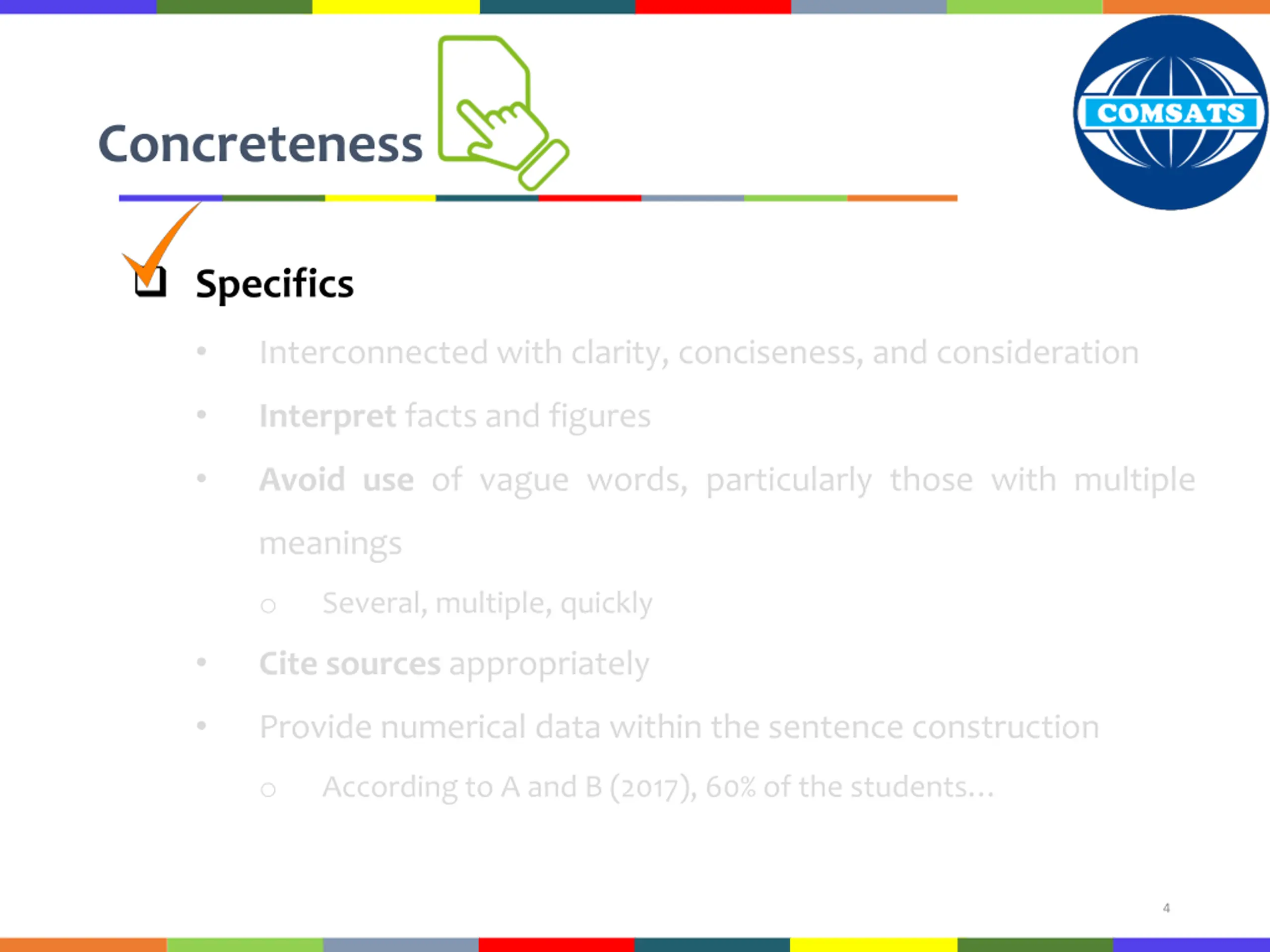 Concreteness Specifics Interconnected with clarity, conciseness, and consideration Interpret facts and figures Avoid use of vague words, particularly those with multiple meanings o Several, multiple, quickly Cite sources appropriately Provide numerical data within the sentence construction o According to A and B (2017), 60% of the students 4