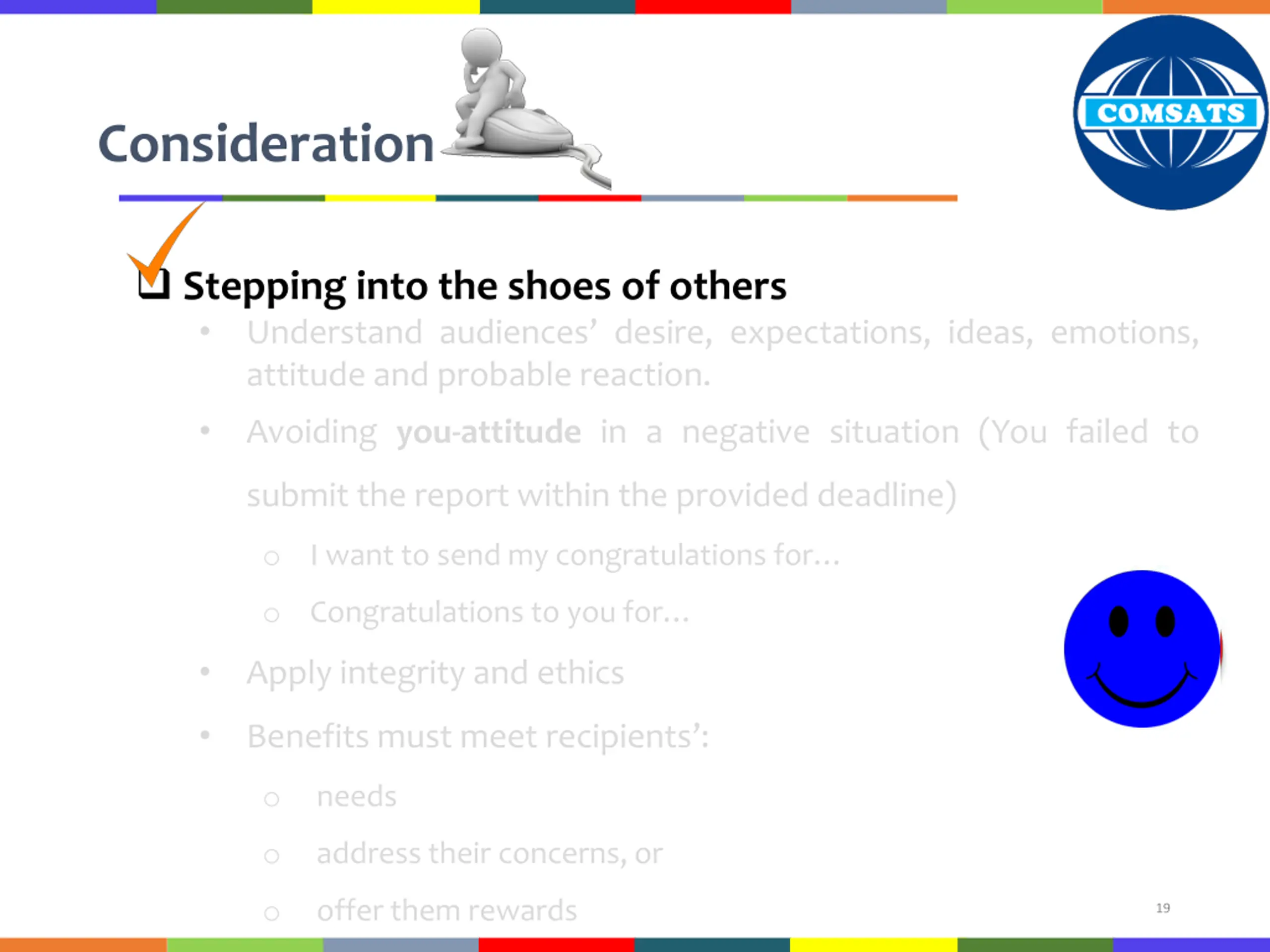 Consideration Stepping into the shoes of others Interconnected with the principle of correctness Consider audience expectations Visual design and good language Make the content comprehensible and appealing Maintaining audience self-respect No harm to their emotions You vs. I and We (You-Attitude) We will be extending our hours to make shopping more convenient You will be able to shop evenings with the extended hours Avoid overuse of however 18