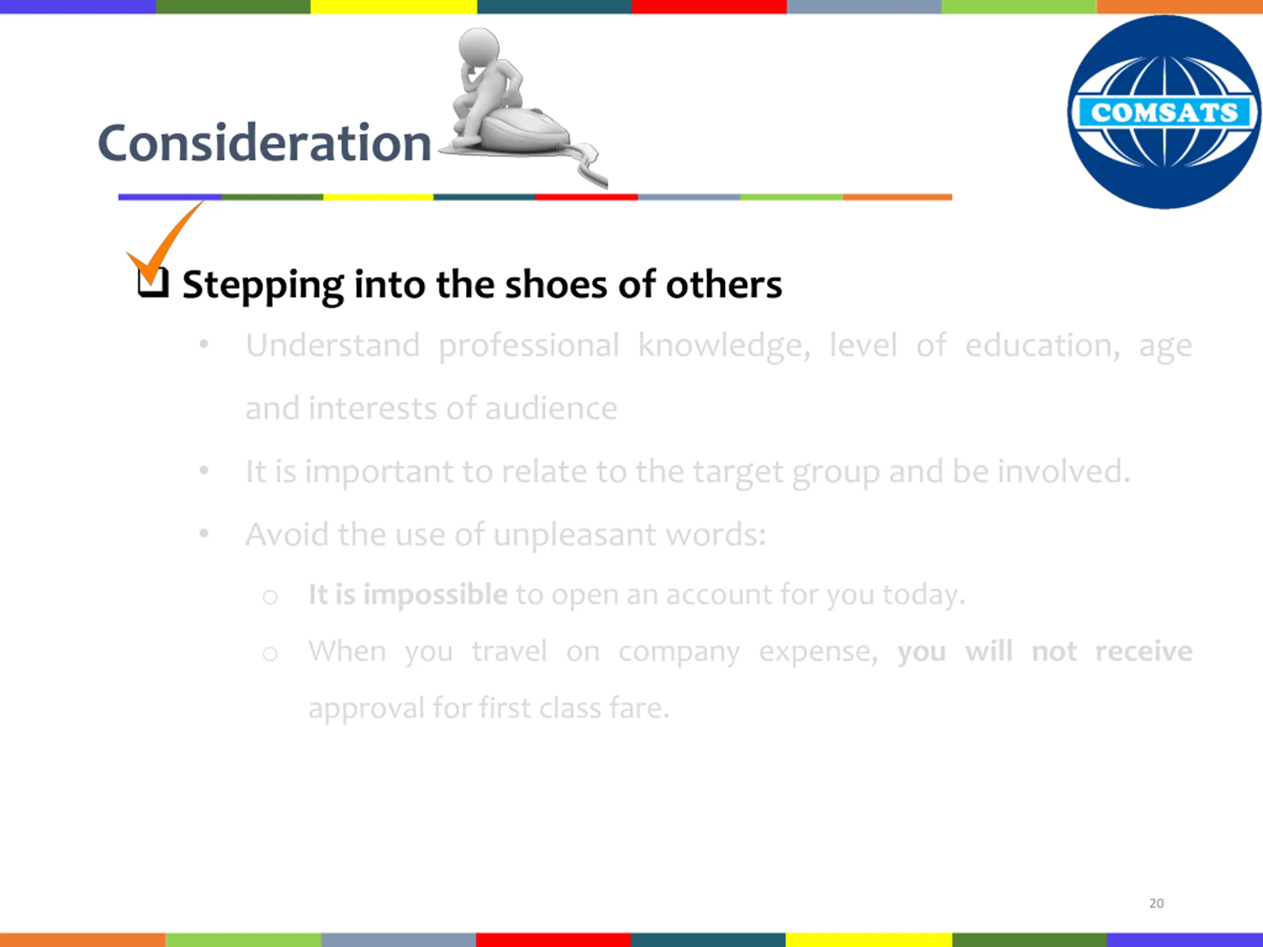 Consideration Stepping into the shoes of others Understand audiences desire, expectations, ideas, emotions, attitude and probable reaction. Avoiding you-attitude in a negative situation (You failed to submit the report within the provided deadline) o I want to send my congratulations for o Congratulations to you for Apply integrity and ethics Benefits must meet recipients : o needs o address their concerns, or o offer them rewards 19