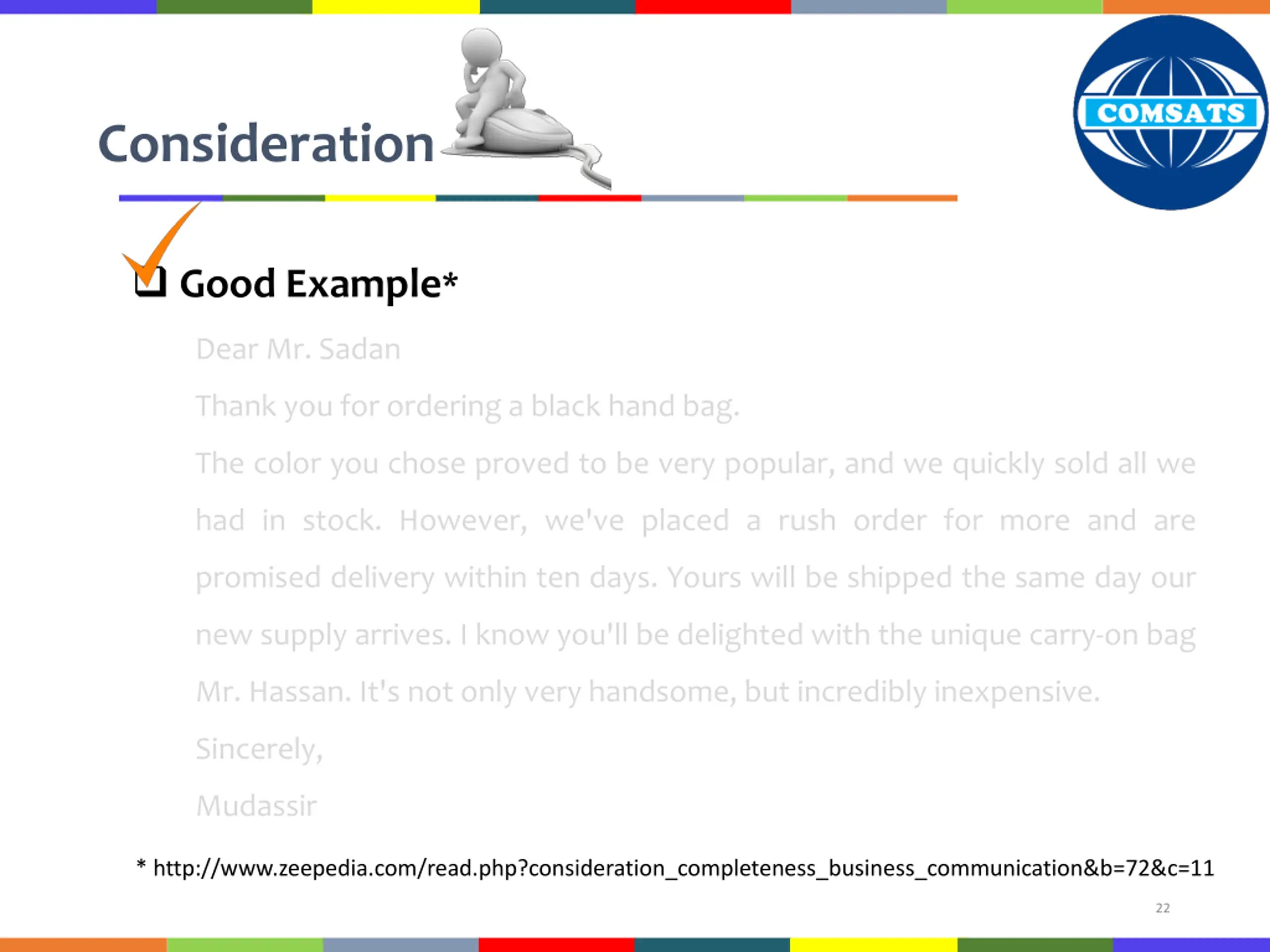 Consideration Good Example* Dear Mr. Sadan Thank you for ordering a black hand bag. The color you chose proved to be very popular, and we quickly sold all we had in stock. However, we've placed a rush order for more and are promised delivery within ten days. Yours will be shipped the same day our new supply arrives. I know you'll be delighted with the unique carry-on bag Mr. Hassan. It's not only very handsome, but incredibly inexpensive. Sincerely, Mudassir * http://www.zeepedia.com/read.php?consideration_completeness_business_communication&b=72&c=11 22
