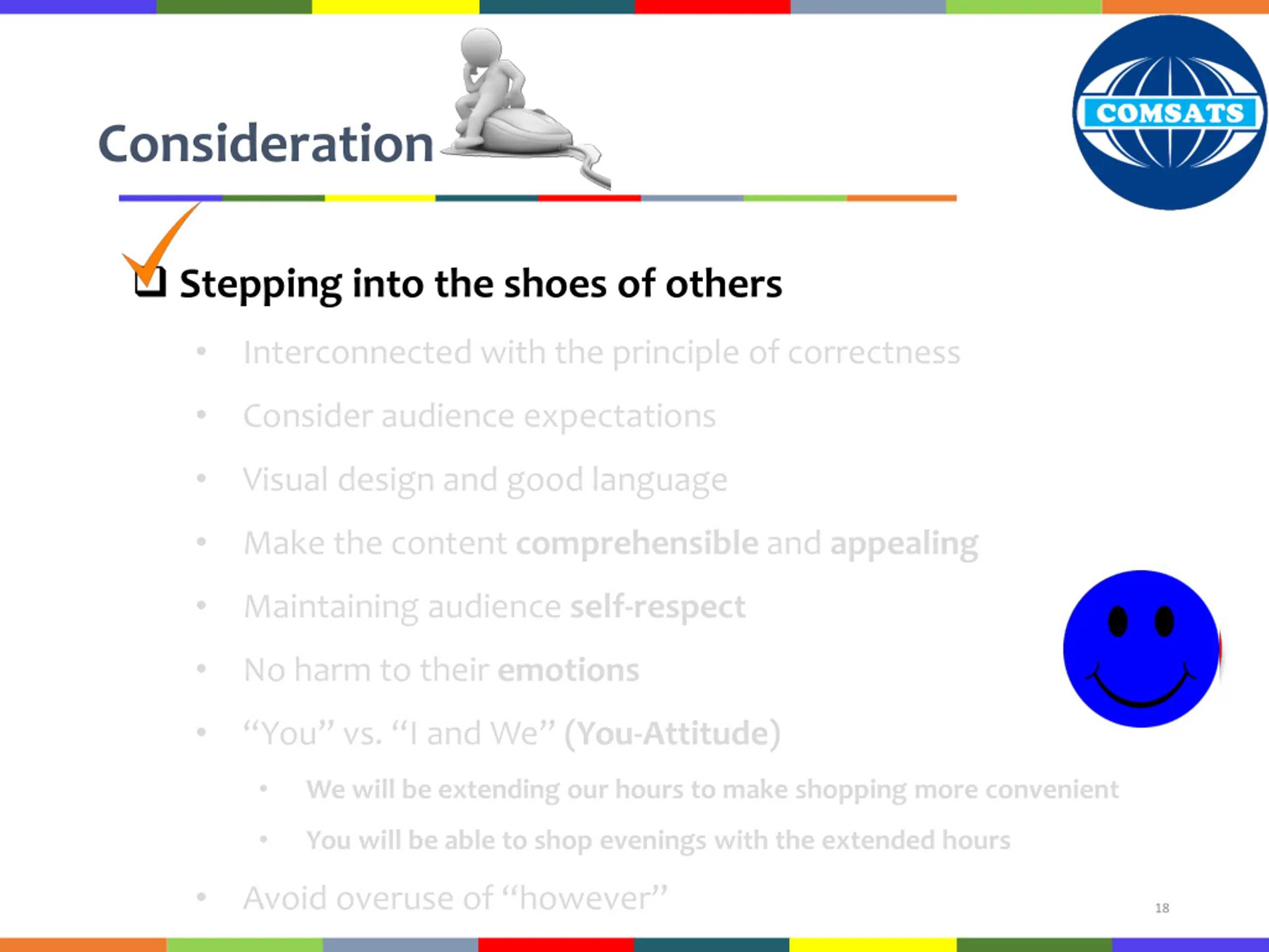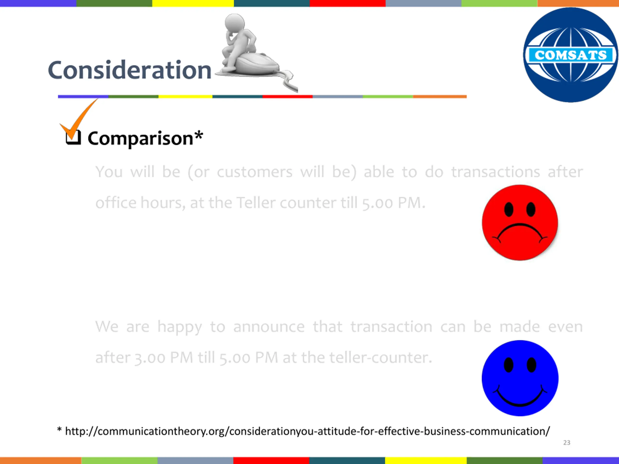 Consideration Comparison* You will be (or customers will be) able to do transactions after office hours, at the Teller counter till 5.00 PM. We are happy to announce that transaction can be made even after 3.00 PM till 5.00 PM at the teller-counter. * http://communicationtheory.org/considerationyou-attitude-for-effective-business-communication/ 23