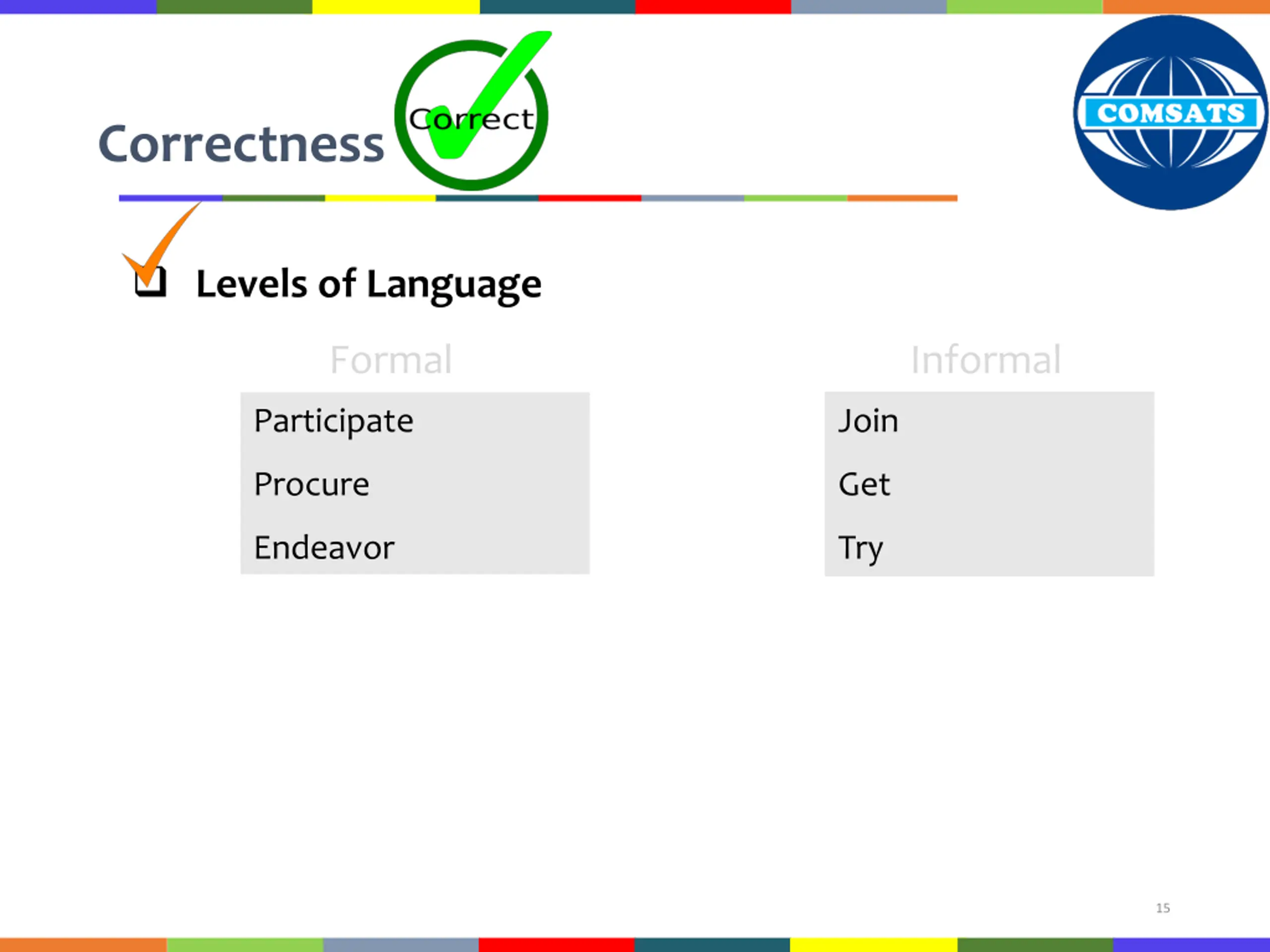 Correctness Levels of Language Formal Informal Participate Join Procure Get Endeavor Try 15