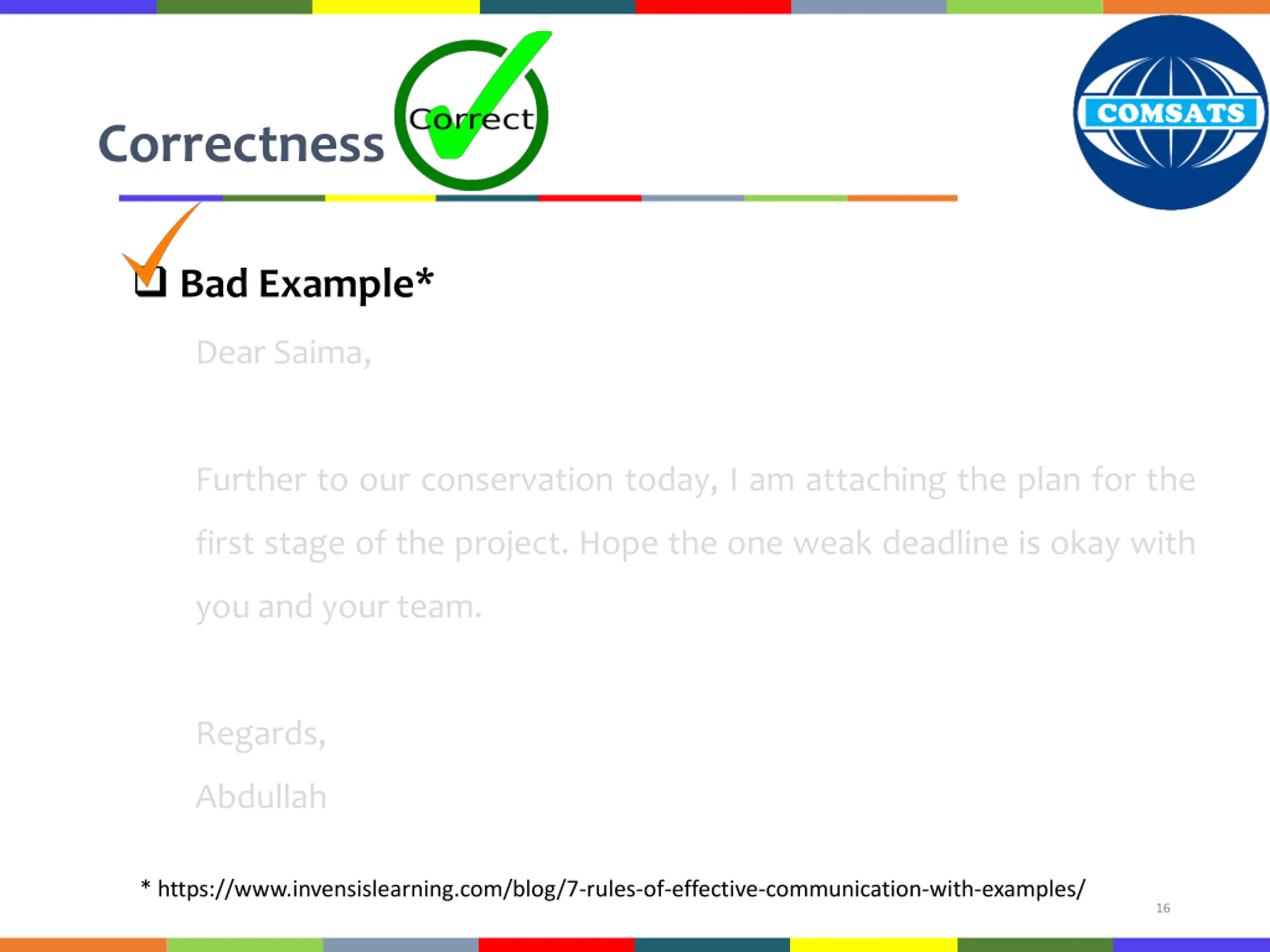 Correctness Bad Example* Dear Saima, Further to our conservation today, I am attaching the plan for the first stage of the project. Hope the one weak deadline is okay with you and your team. Regards, Abdullah * https://www.invensislearning.com/blog/7-rules-of-effective-communication-with-examples/ 16