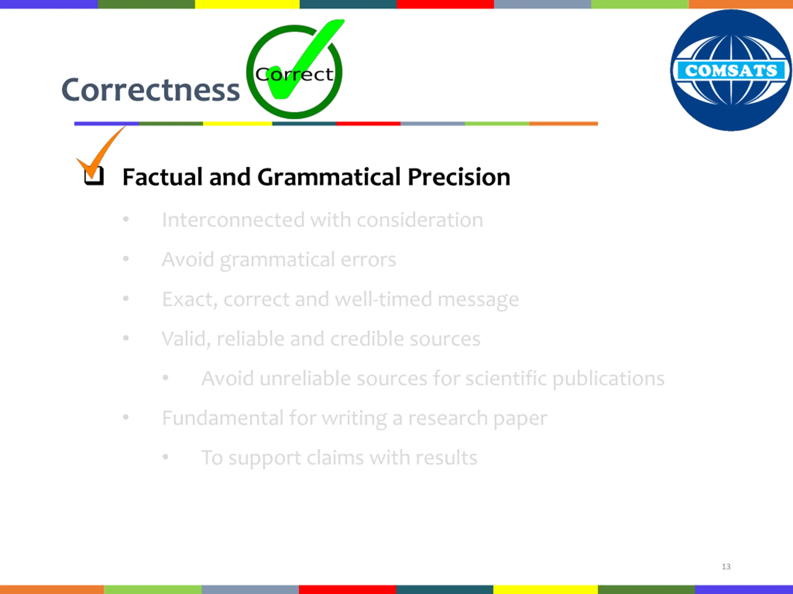 Correctness Factual and Grammatical Precision Interconnected with consideration Avoid grammatical errors Exact, correct and well-timed message Valid, reliable and credible sources Avoid unreliable sources for scientific publications Fundamental for writing a research paper To support claims with results 13
