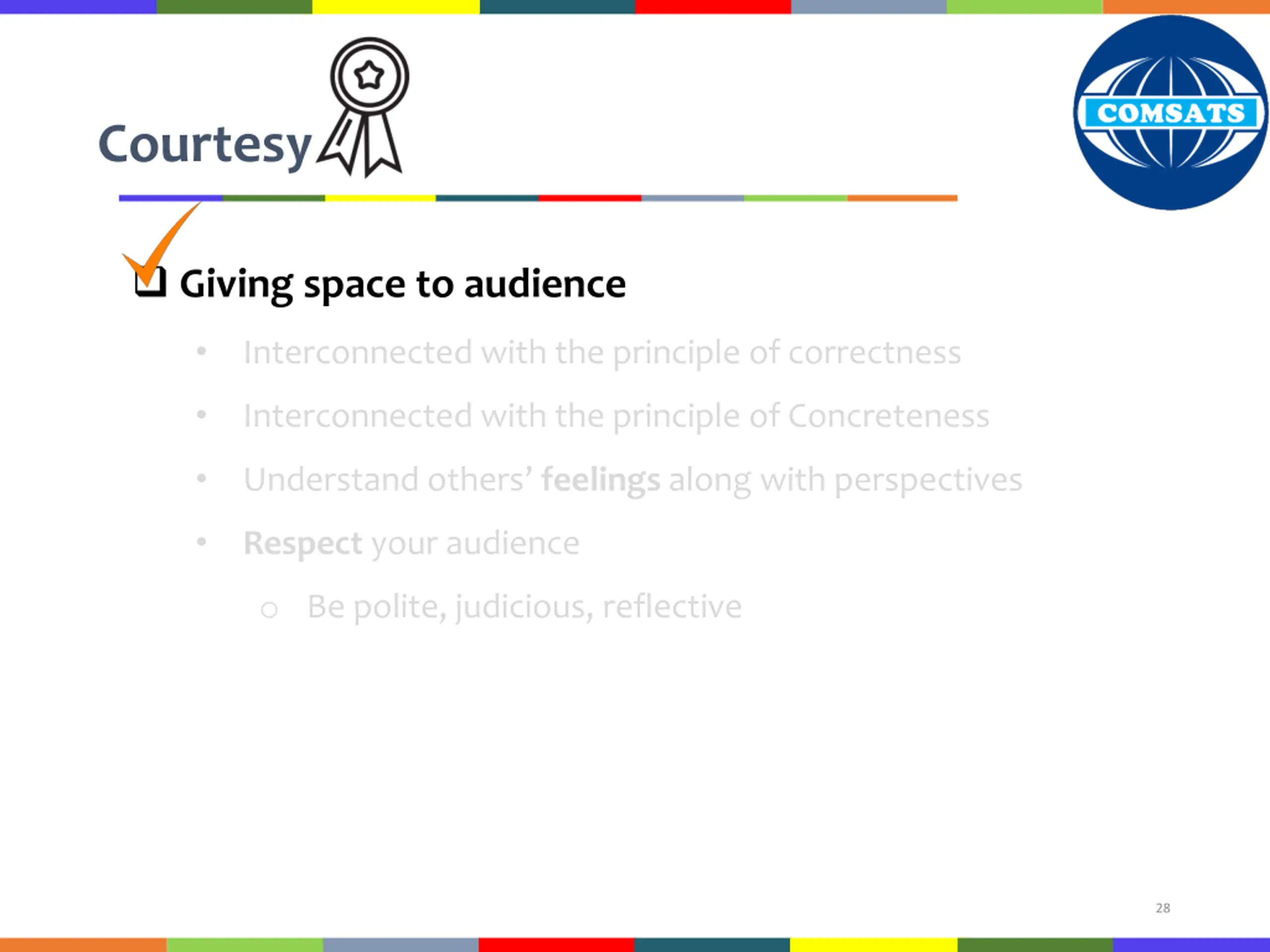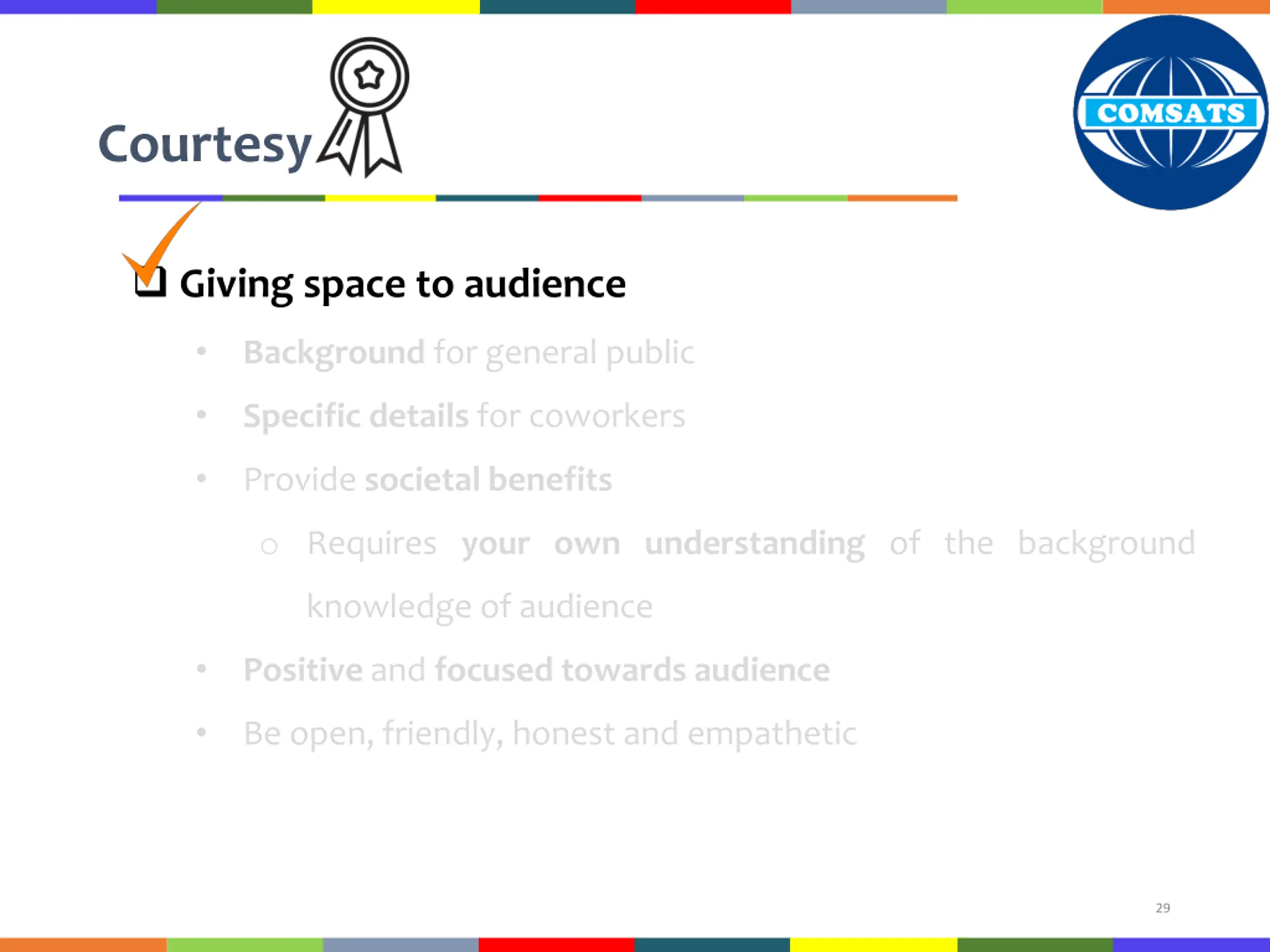 Courtesy Giving space to audience Interconnected with the principle of correctness Interconnected with the principle of Concreteness Understand others feelings along with perspectives Respect your audience o Be polite, judicious, reflective 28