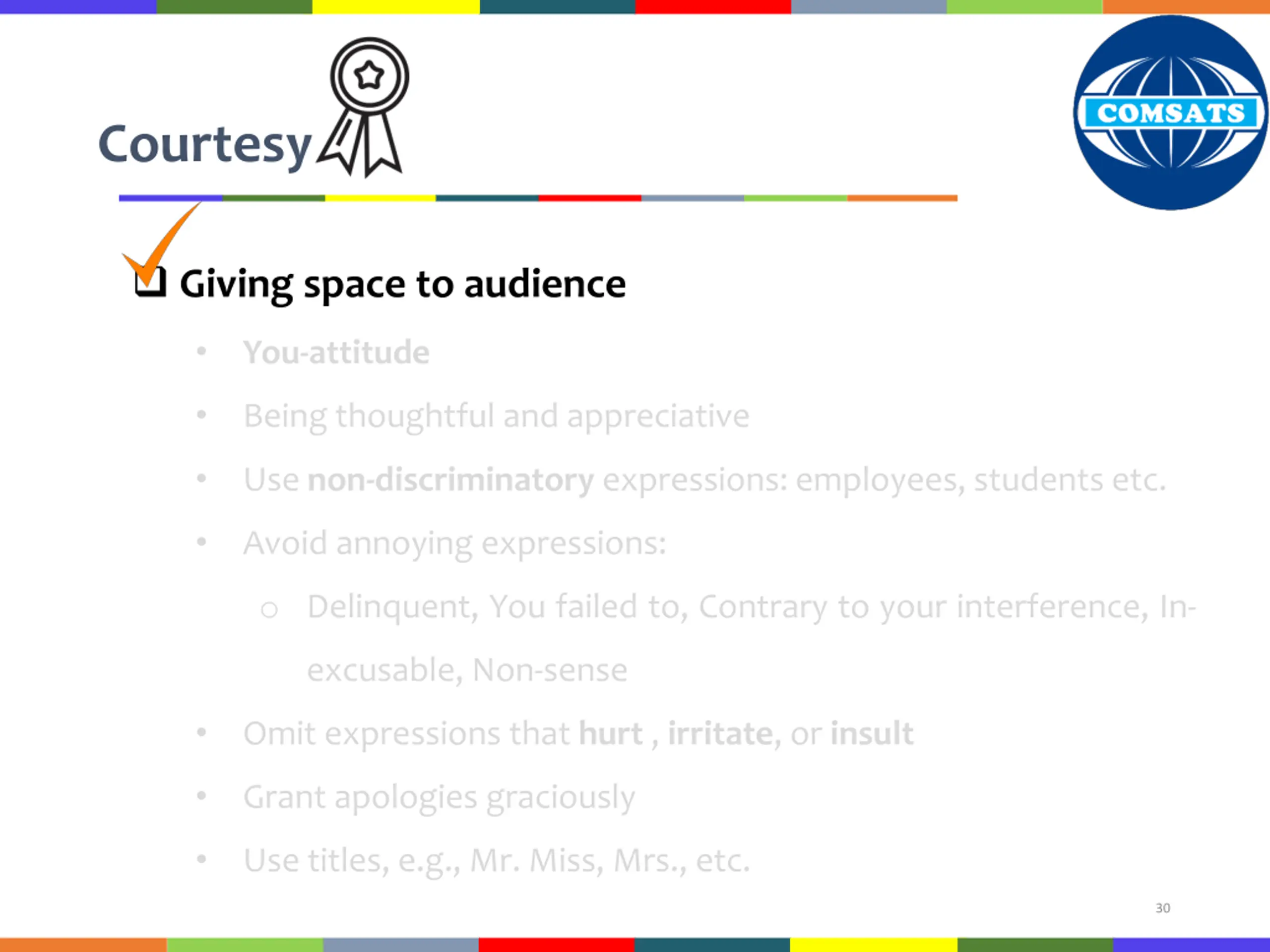Courtesy Giving space to audience Background for general public Specific details for coworkers Provide societal benefits o Requires your own understanding of the background knowledge of audience Positive and focused towards audience Be open, friendly, honest and empathetic 29