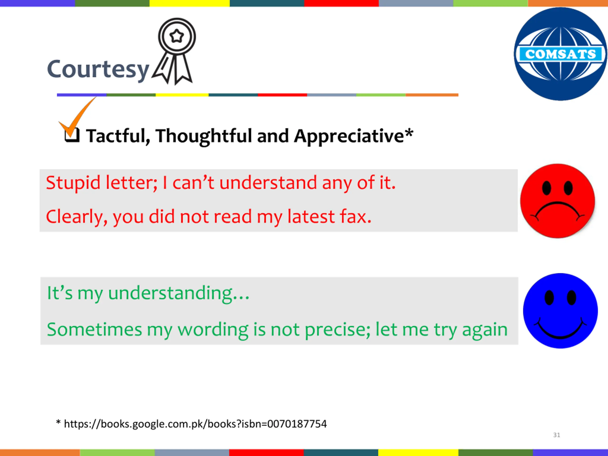 Courtesy Tactful, Thoughtful and Appreciative* Stupid letter; I can t understand any of it. Clearly, you did not read my latest fax. It s my understanding Sometimes my wording is not precise; let me try again * https://books.google.com.pk/books?isbn=0070187754 31