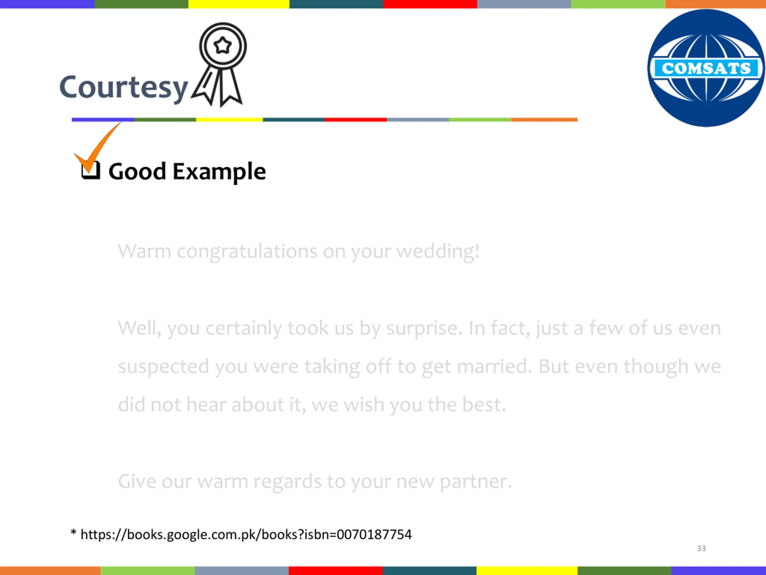 Courtesy Good Example Warm congratulations on your wedding! Well, you certainly took us by surprise. In fact, just a few of us even suspected you were taking off to get married. But even though we did not hear about it, we wish you the best. Give our warm regards to your new partner. * https://books.google.com.pk/books?isbn=0070187754 33