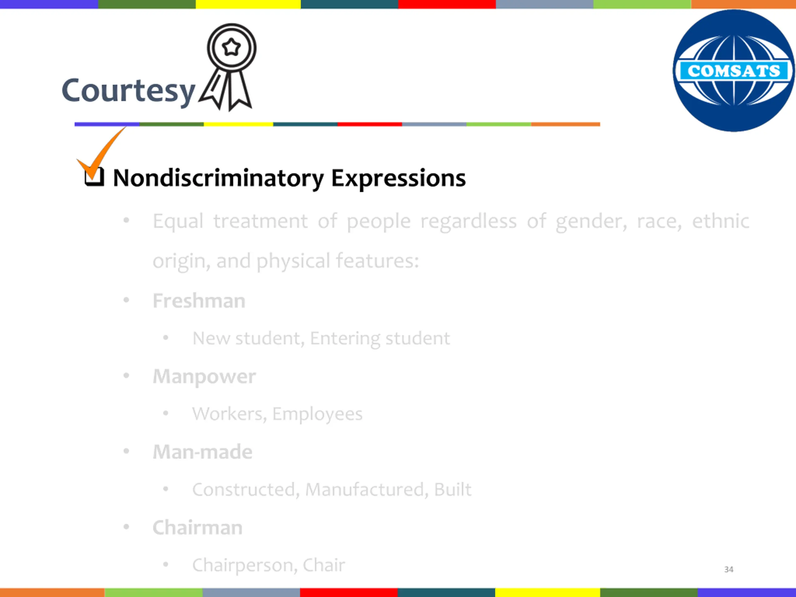 Courtesy Nondiscriminatory Expressions Equal treatment of people regardless of gender, race, ethnic origin, and physical features: Freshman New student, Entering student Manpower Workers, Employees Man-made Constructed, Manufactured, Built Chairman Chairperson, Chair 34