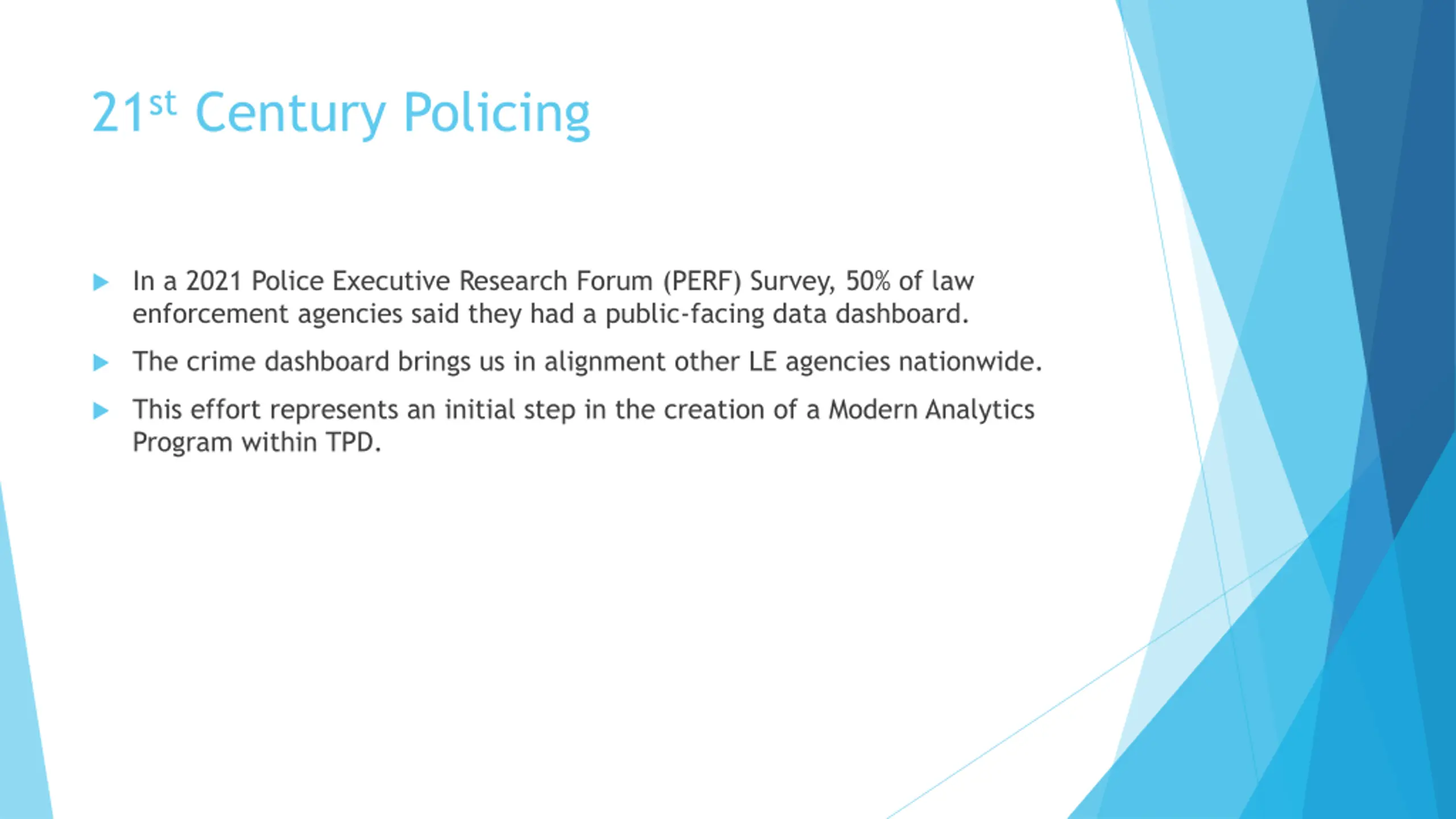21stCentury Policing In a 2021 Police Executive Research Forum (PERF) Survey, 50% of law enforcement agencies said they had a public-facing data dashboard. The crime dashboard brings us in alignment other LE agencies nationwide. This effort represents an initial step in the creation of a Modern Analytics Program within TPD.