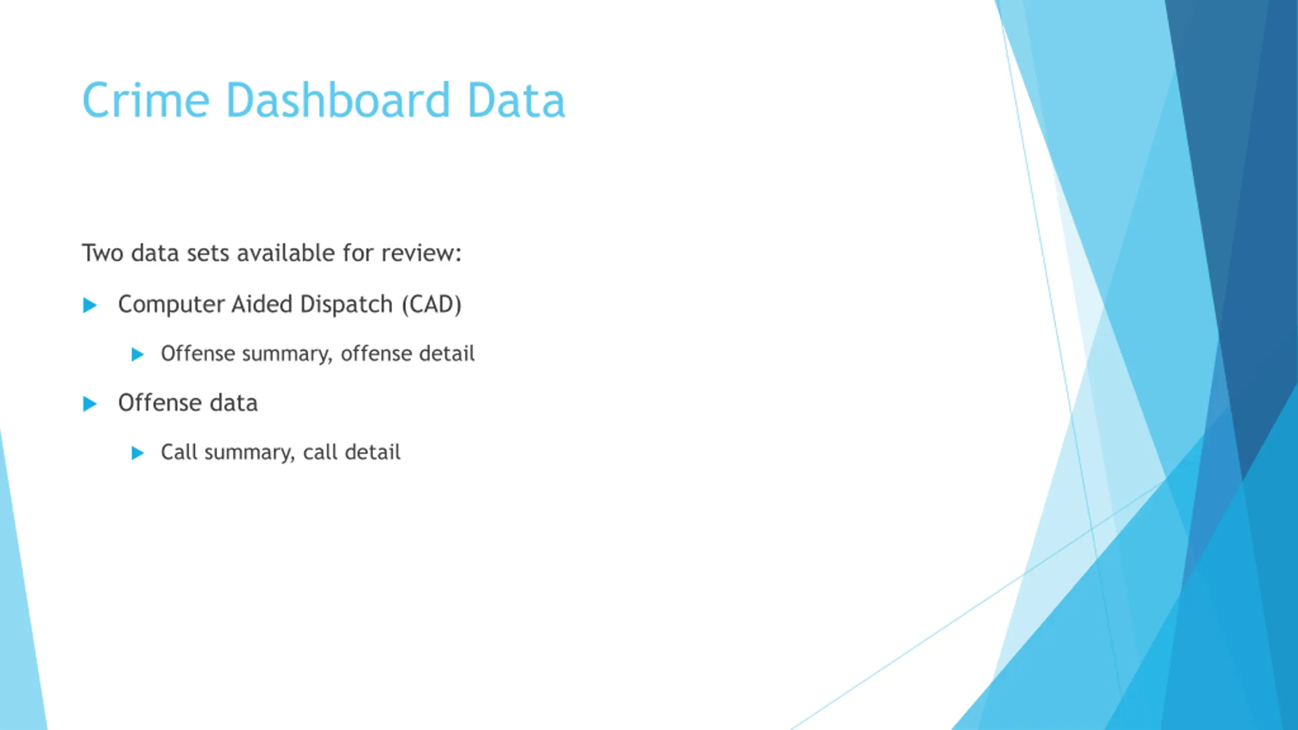 Crime Dashboard Data Two data sets available for review: Computer Aided Dispatch (CAD) Offense summary, offense detail Offense data Call summary, call detail