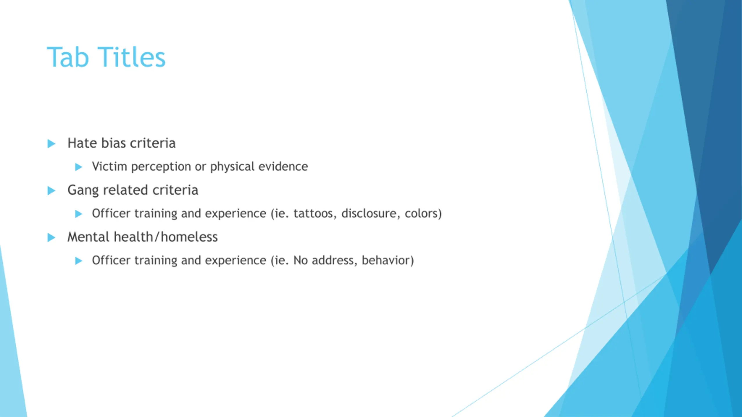 Tab Titles Hate bias criteria Victim perception or physical evidence Gang related criteria Officer training and experience (ie. tattoos, disclosure, colors) Mental health/homeless Officer training and experience (ie. No address, behavior)