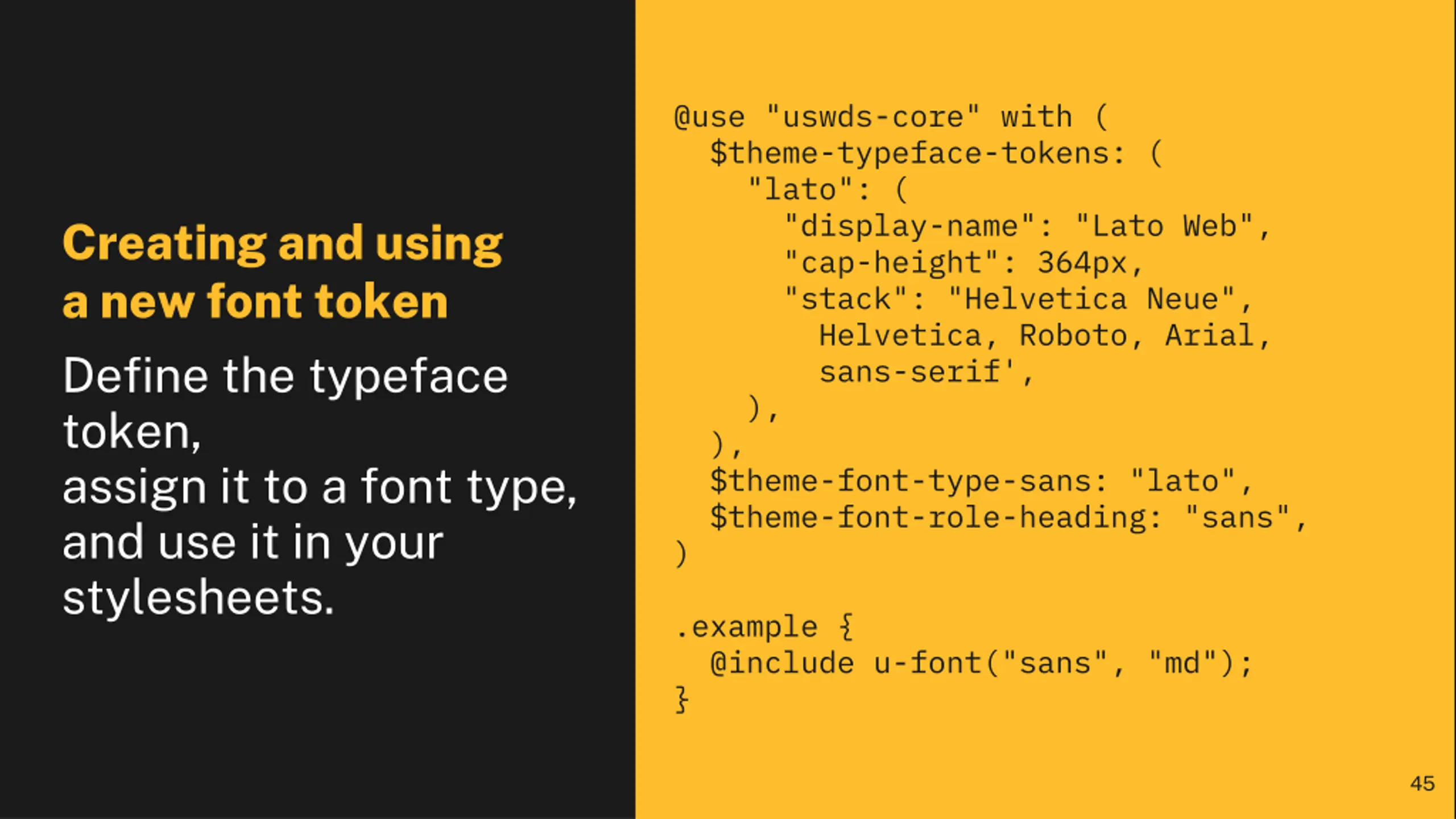 @use "uswds-core" with ( $theme-typeface-tokens: ( "lato": ( "display-name": "Lato Web", "cap-height": 364px, "stack": "Helvetica Neue", Helvetica, Roboto, Arial, sans-serif', ), ), $theme-font-type-sans: "lato", $theme-font-role-heading: "sans", ) Creating and using a new font token Define the typeface token, assign it to a font type, and use it in your stylesheets. .example { @include u-font("sans", "md"); } 45
