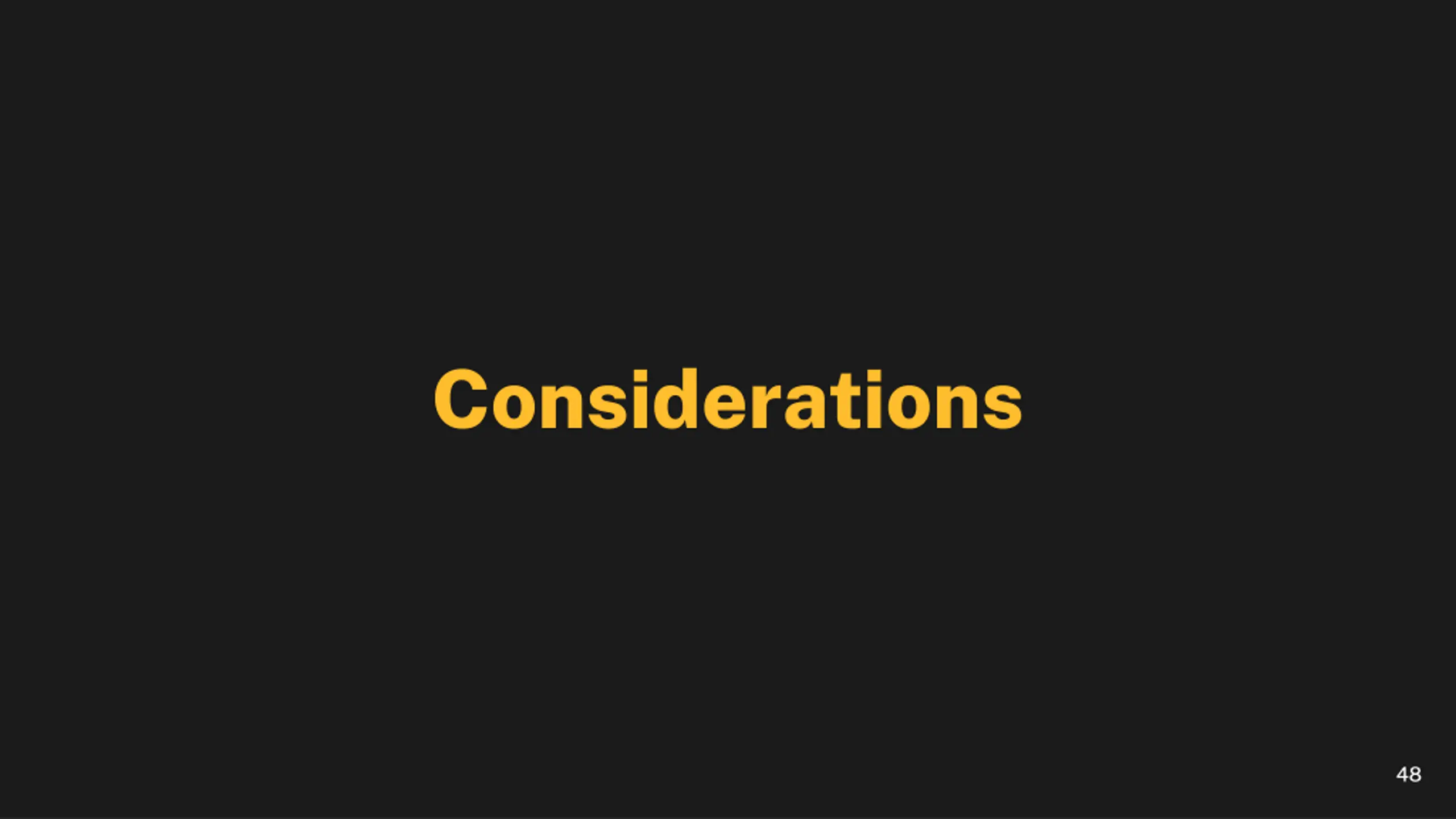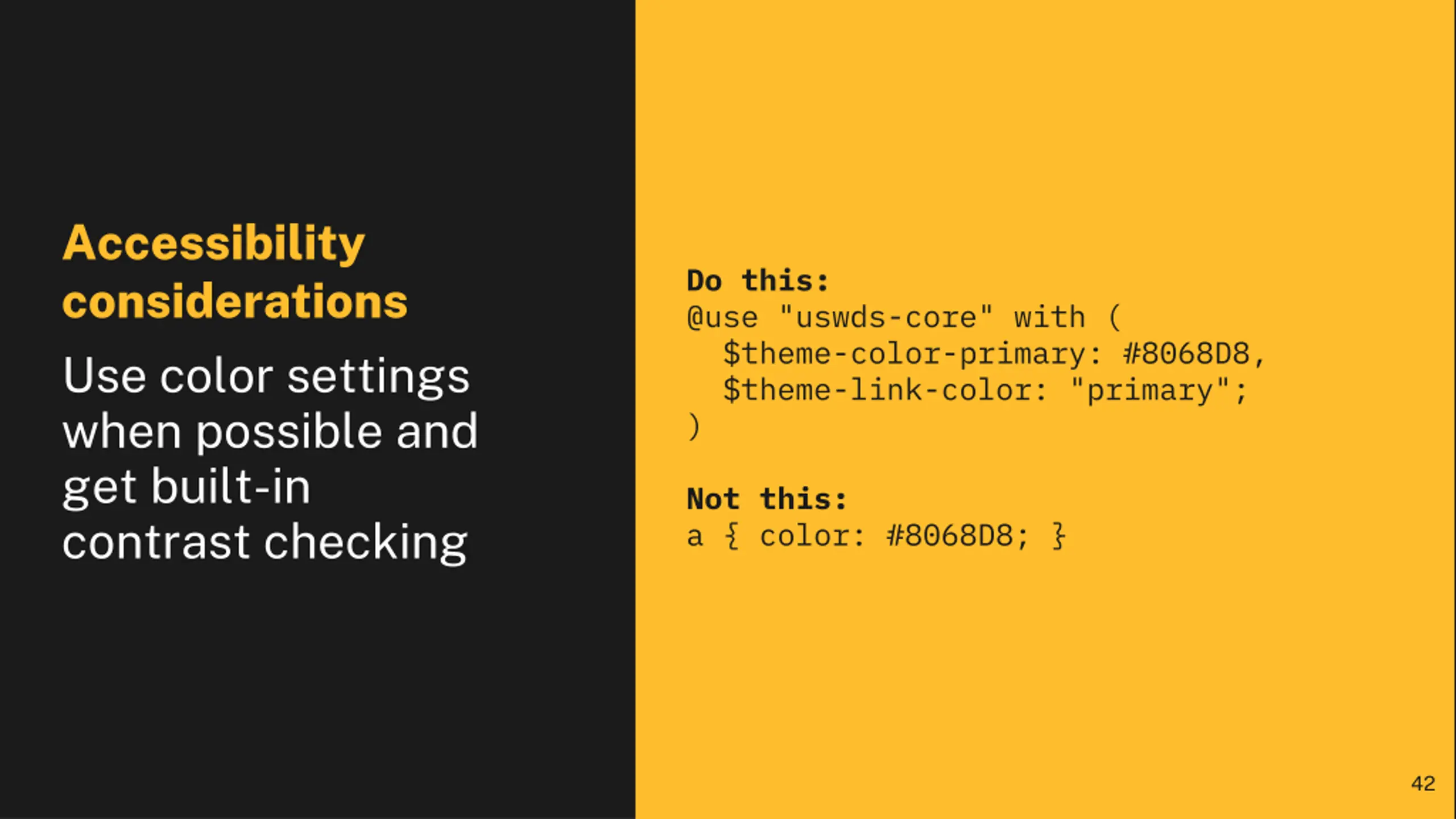 Accessibility considerations Use color settings when possible and get built-in contrast checking Do this: @use "uswds-core" with ( $theme-color-primary: #8068D8, $theme-link-color: "primary"; ) Not this: a { color: #8068D8; } 42