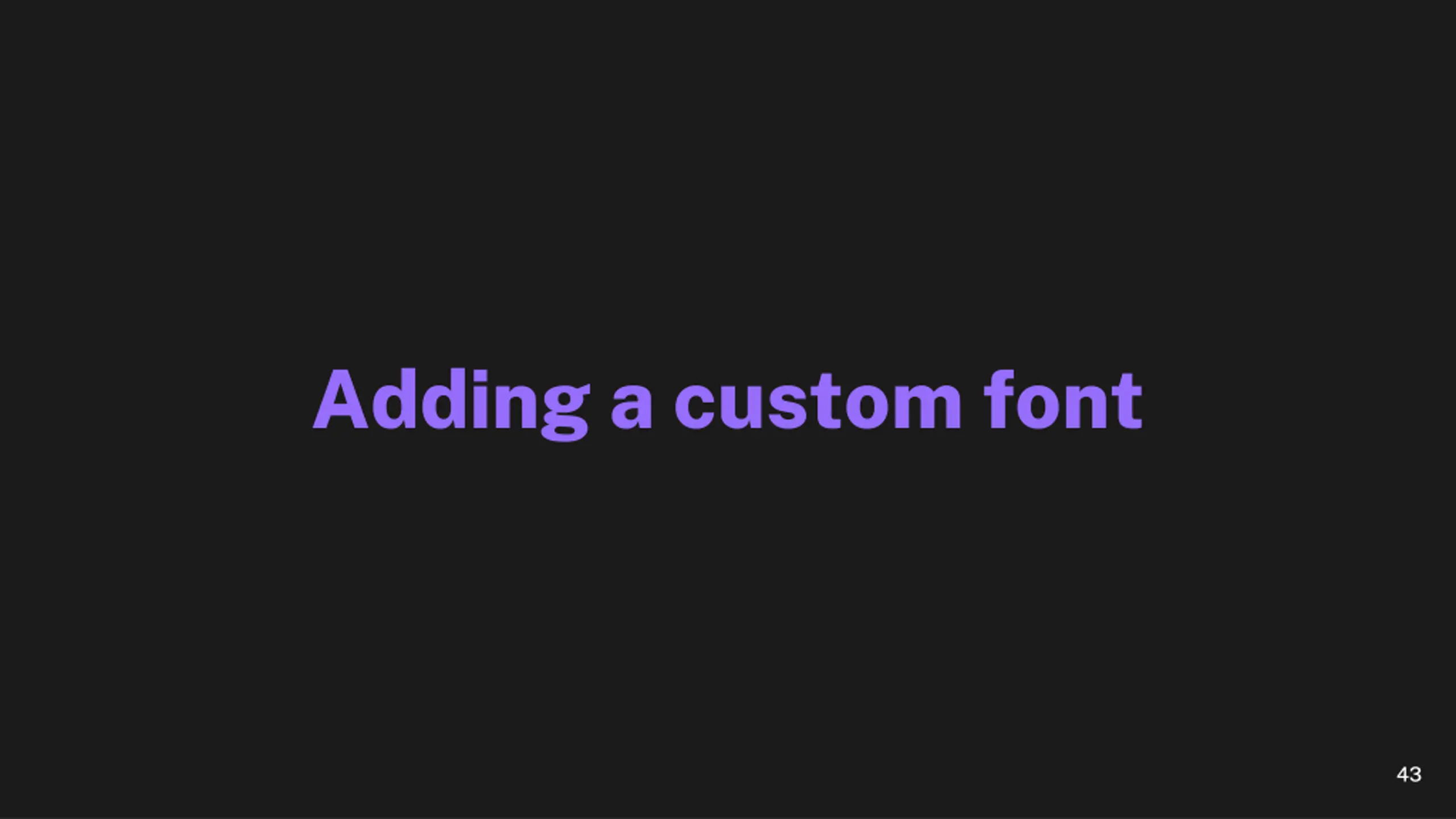 Adding a font from a hosting service 1. Add a reference to the JavaScript and CSS provided by the font hosting service in the head of your markup 2.Create a new font token in USWDS 3.Use the font new token in your theme 44