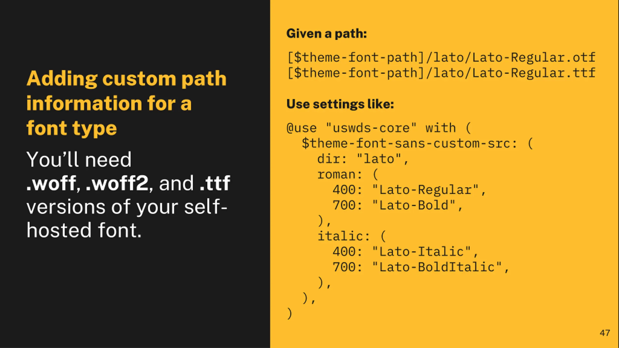 Given a path: [$theme-font-path]/lato/Lato-Regular.otf [$theme-font-path]/lato/Lato-Regular.ttf Adding custom path information for a font type You ll need .woff, .woff2, and .ttf versions of your self- hosted font. Use settings like: @use "uswds-core" with ( $theme-font-sans-custom-src: ( dir: "lato", roman: ( 400: "Lato-Regular", 700: "Lato-Bold", ), italic: ( 400: "Lato-Italic", 700: "Lato-BoldItalic", ), ), ) 47