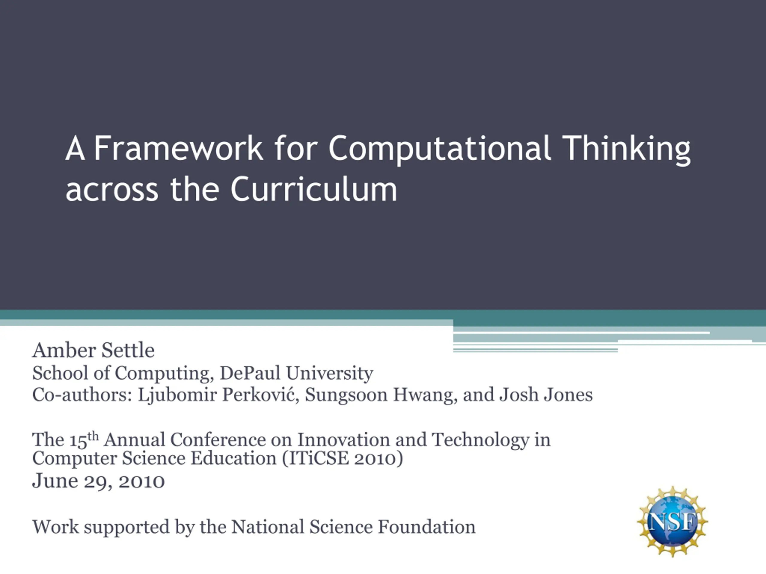 A Framework for Computational Thinking across the Curriculum Amber Settle School of Computing, DePaul University Co-authors: Ljubomir Perkovi , Sungsoon Hwang, and Josh Jones The 15thAnnual Conference on Innovation and Technology in Computer Science Education (ITiCSE 2010) June 29, 2010 Work supported by the National Science Foundation