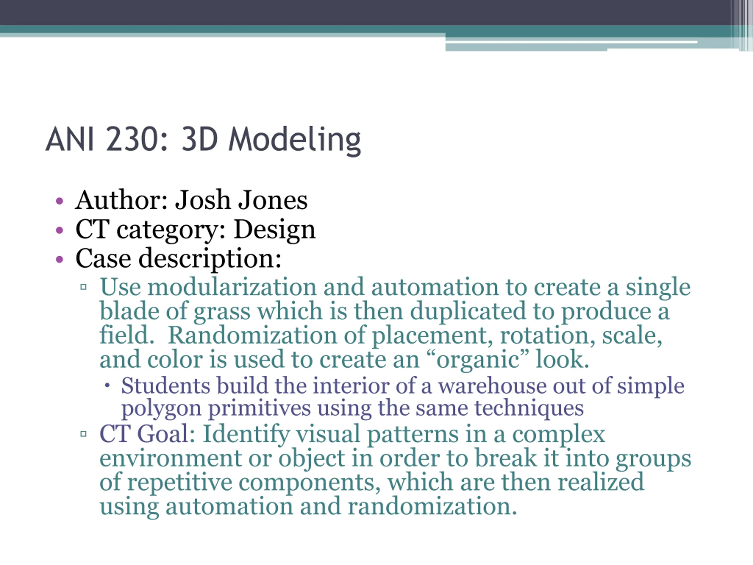 ANI 230: 3D Modeling Author: Josh Jones CT category: Design Case description: Use modularization and automation to create a single blade of grass which is then duplicated to produce a field. Randomization of placement, rotation, scale, and color is used to create an organic look. Students build the interior of a warehouse out of simple polygon primitives using the same techniques CT Goal: Identify visual patterns in a complex environment or object in order to break it into groups of repetitive components, which are then realized using automation and randomization.