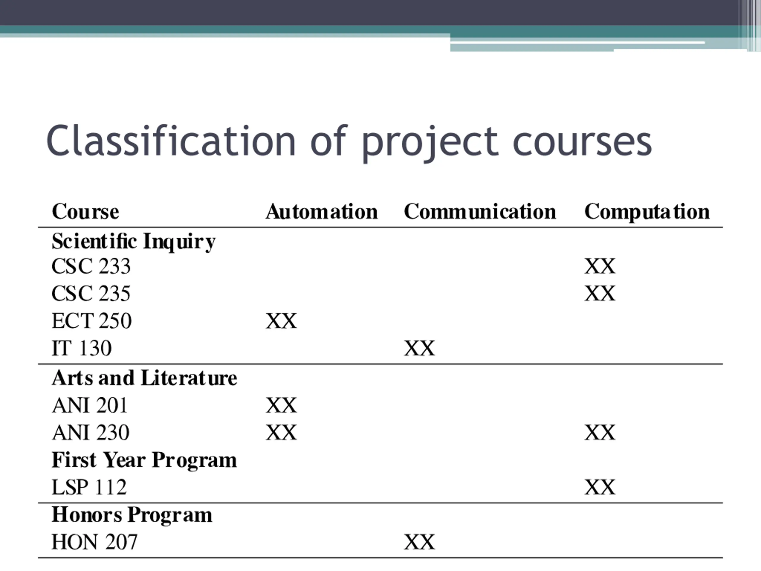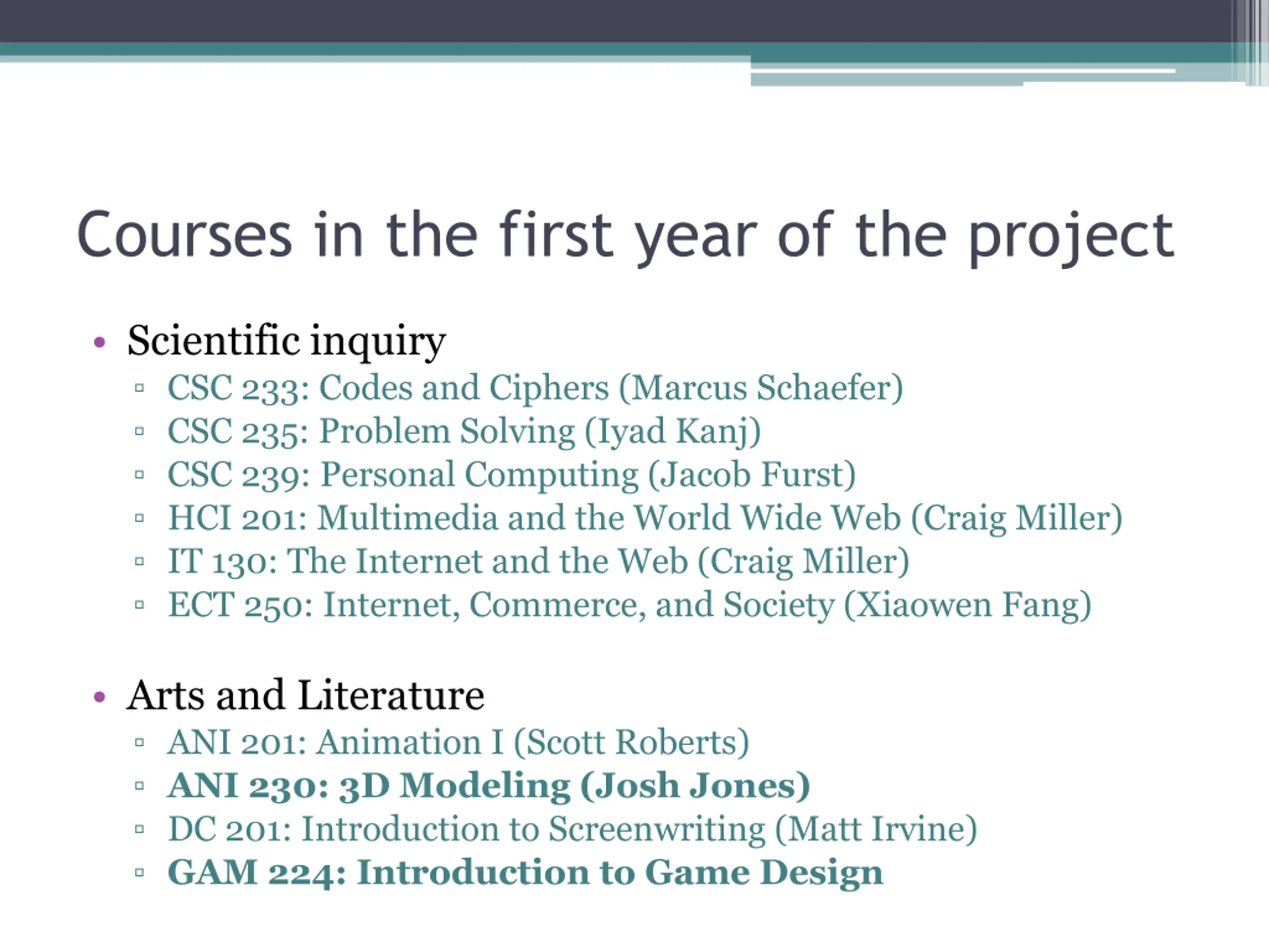 Courses in the first year of the project Scientific inquiry CSC 233: Codes and Ciphers (Marcus Schaefer) CSC 235: Problem Solving (Iyad Kanj) CSC 239: Personal Computing (Jacob Furst) HCI 201: Multimedia and the World Wide Web (Craig Miller) IT 130: The Internet and the Web (Craig Miller) ECT 250: Internet, Commerce, and Society (Xiaowen Fang) Arts and Literature ANI 201: Animation I (Scott Roberts) ANI 230: 3D Modeling (Josh Jones) DC 201: Introduction to Screenwriting (Matt Irvine) GAM 224: Introduction to Game Design