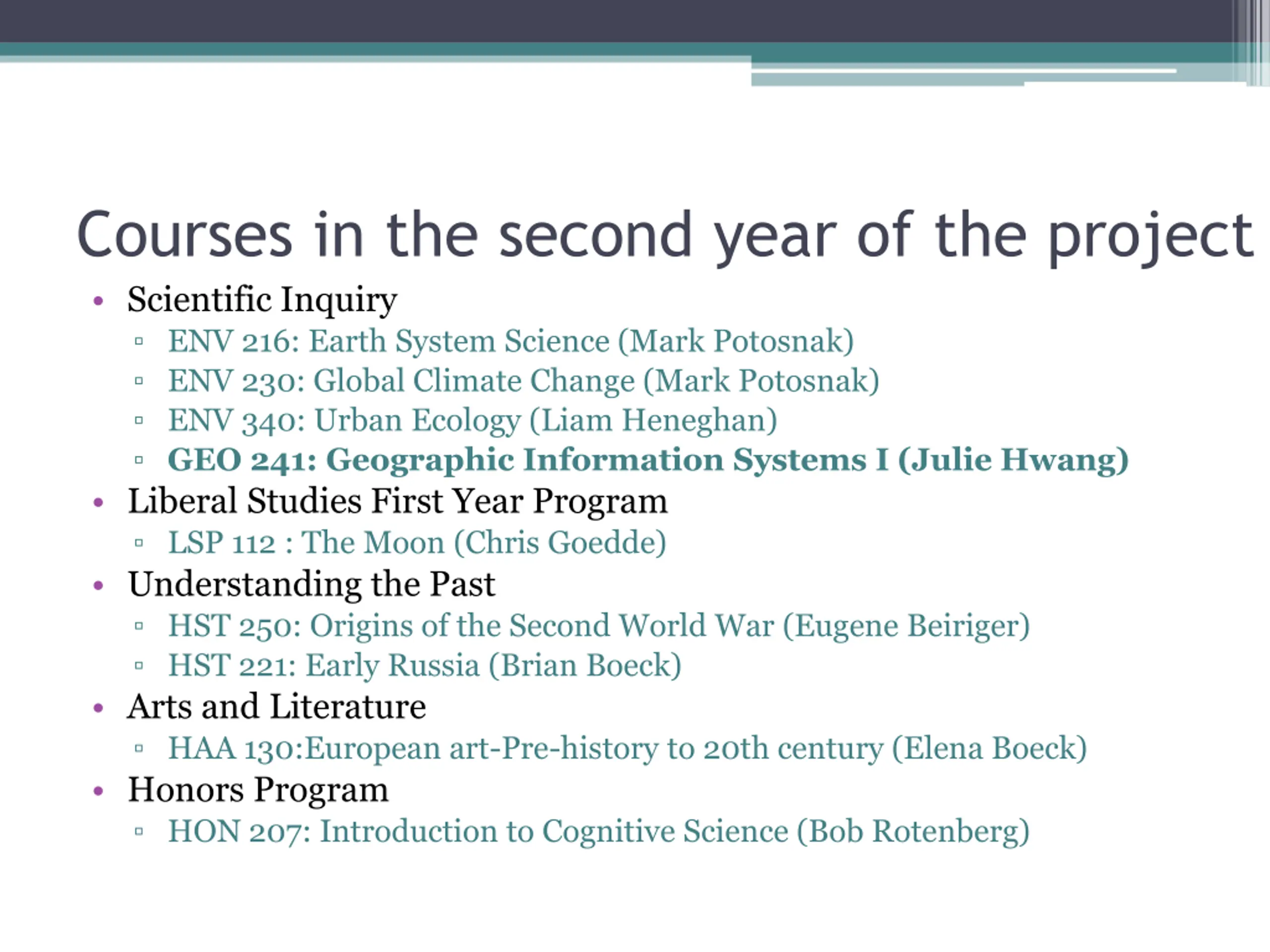 Courses in the second year of the project Scientific Inquiry ENV 216: Earth System Science (Mark Potosnak) ENV 230: Global Climate Change (Mark Potosnak) ENV 340: Urban Ecology (Liam Heneghan) GEO 241: Geographic Information Systems I (Julie Hwang) Liberal Studies First Year Program LSP 112 : The Moon (Chris Goedde) Understanding the Past HST 250: Origins of the Second World War (Eugene Beiriger) HST 221: Early Russia (Brian Boeck) Arts and Literature HAA 130:European art-Pre-history to 20th century (Elena Boeck) Honors Program HON 207: Introduction to Cognitive Science (Bob Rotenberg)