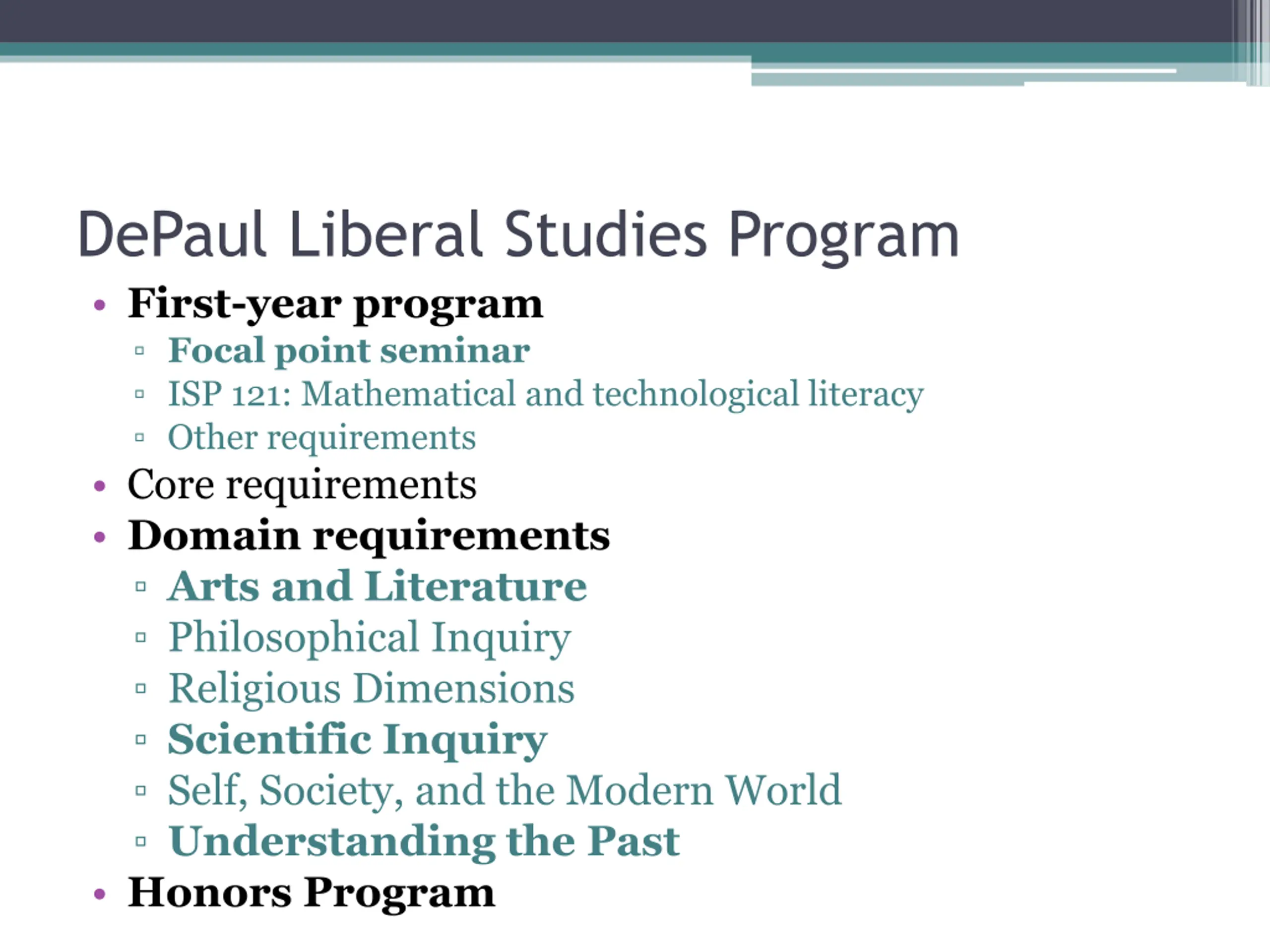 DePaul Liberal Studies Program First-year program Focal point seminar ISP 121: Mathematical and technological literacy Other requirements Core requirements Domain requirements Arts and Literature Philosophical Inquiry Religious Dimensions Scientific Inquiry Self, Society, and the Modern World Understanding the Past Honors Program