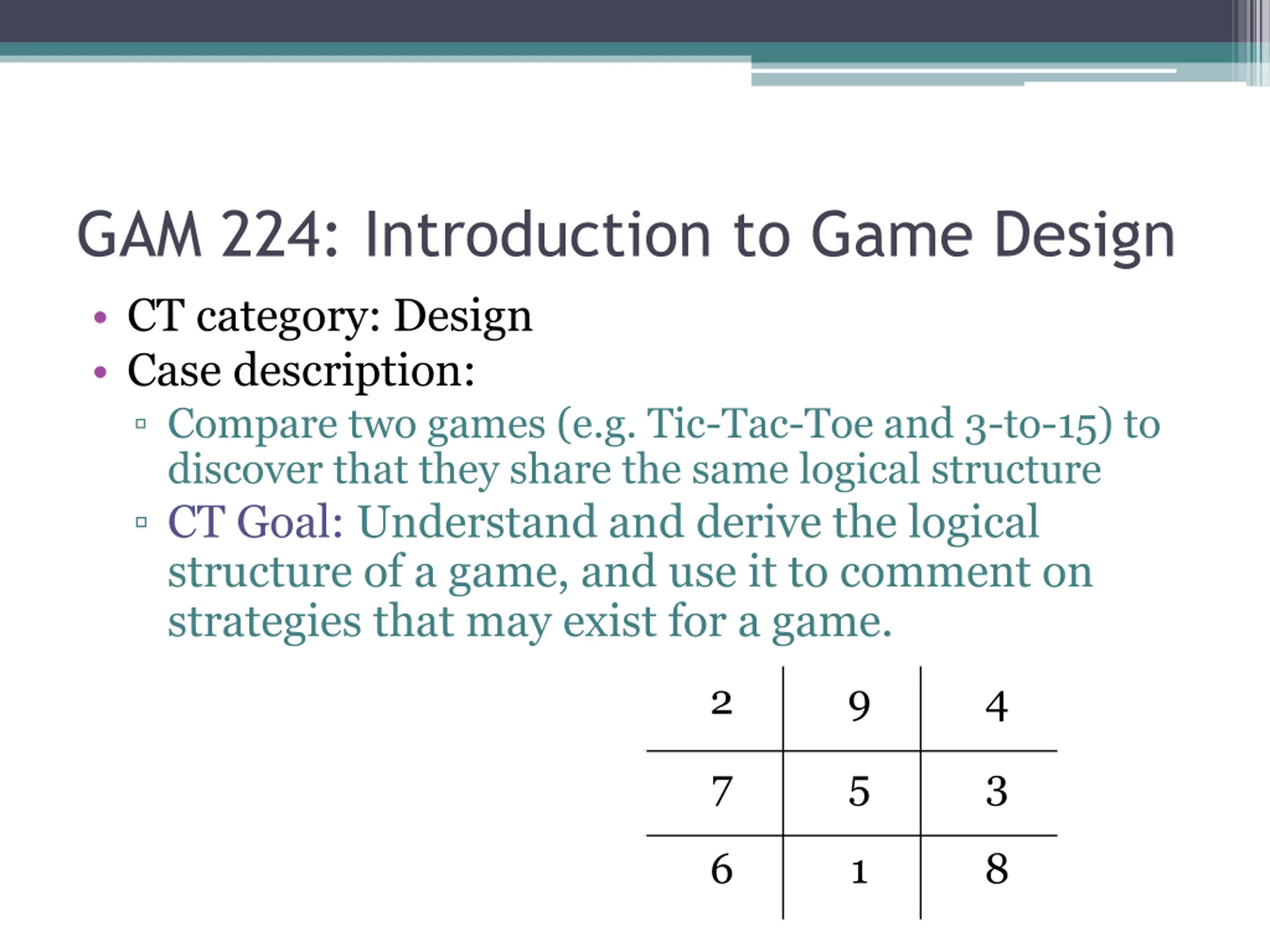 GAM 224: Introduction to Game Design CT category: Design Case description: Compare two games (e.g. Tic-Tac-Toe and 3-to-15) to discover that they share the same logical structure CT Goal: Understand and derive the logical structure of a game, and use it to comment on strategies that may exist for a game. 2 9 4 7 5 3 6 1 8