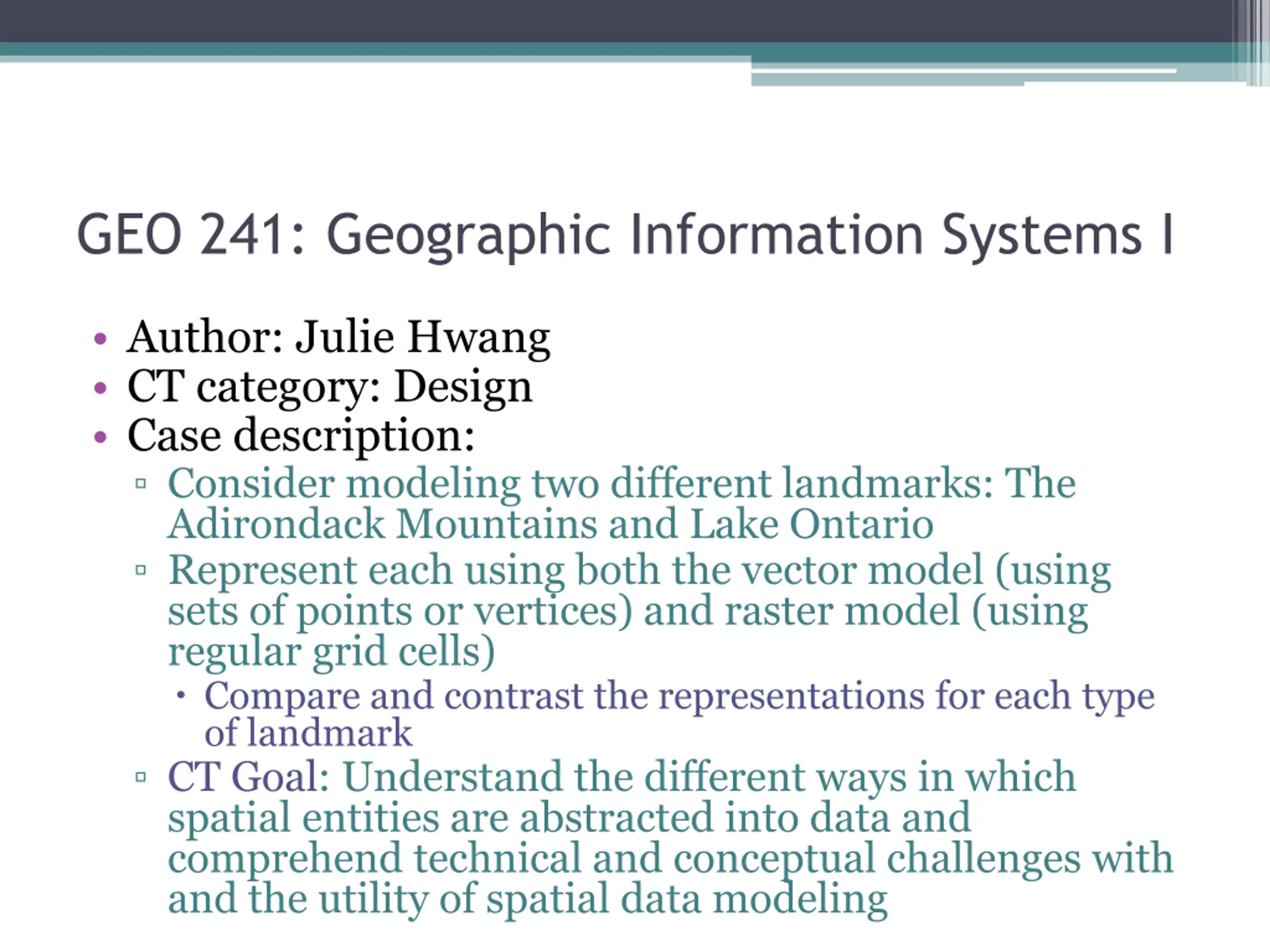 GEO 241: Geographic Information Systems I Author: Julie Hwang CT category: Design Case description: Consider modeling two different landmarks: The Adirondack Mountains and Lake Ontario Represent each using both the vector model (using sets of points or vertices) and raster model (using regular grid cells) Compare and contrast the representations for each type of landmark CT Goal: Understand the different ways in which spatial entities are abstracted into data and comprehend technical and conceptual challenges with and the utility of spatial data modeling
