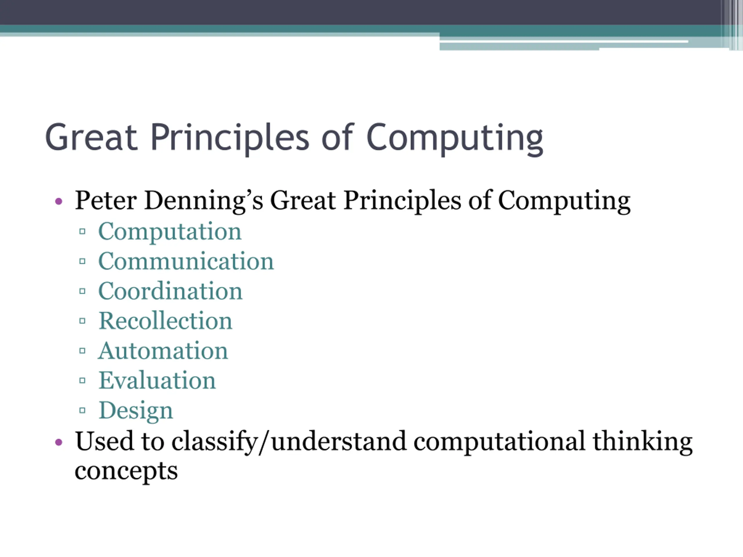 Great Principles of Computing Peter Denning s Great Principles of Computing Computation Communication Coordination Recollection Automation Evaluation Design Used to classify/understand computational thinking concepts
