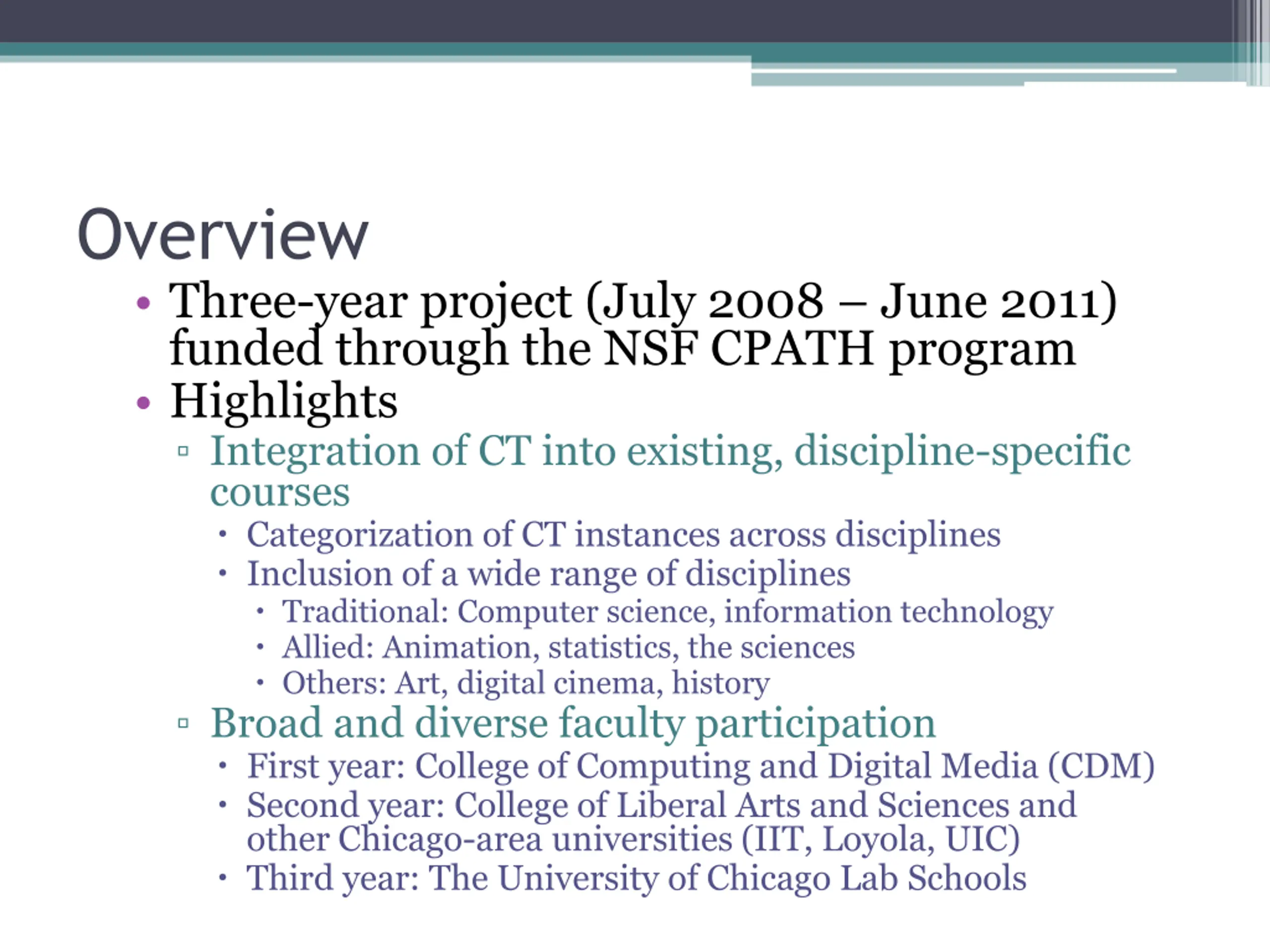 Overview Three-year project (July 2008 June 2011) funded through the NSF CPATH program Highlights Integration of CT into existing, discipline-specific courses Categorization of CT instances across disciplines Inclusion of a wide range of disciplines Traditional: Computer science, information technology Allied: Animation, statistics, the sciences Others: Art, digital cinema, history Broad and diverse faculty participation First year: College of Computing and Digital Media (CDM) Second year: College of Liberal Arts and Sciences and other Chicago-area universities (IIT, Loyola, UIC) Third year: The University of Chicago Lab Schools