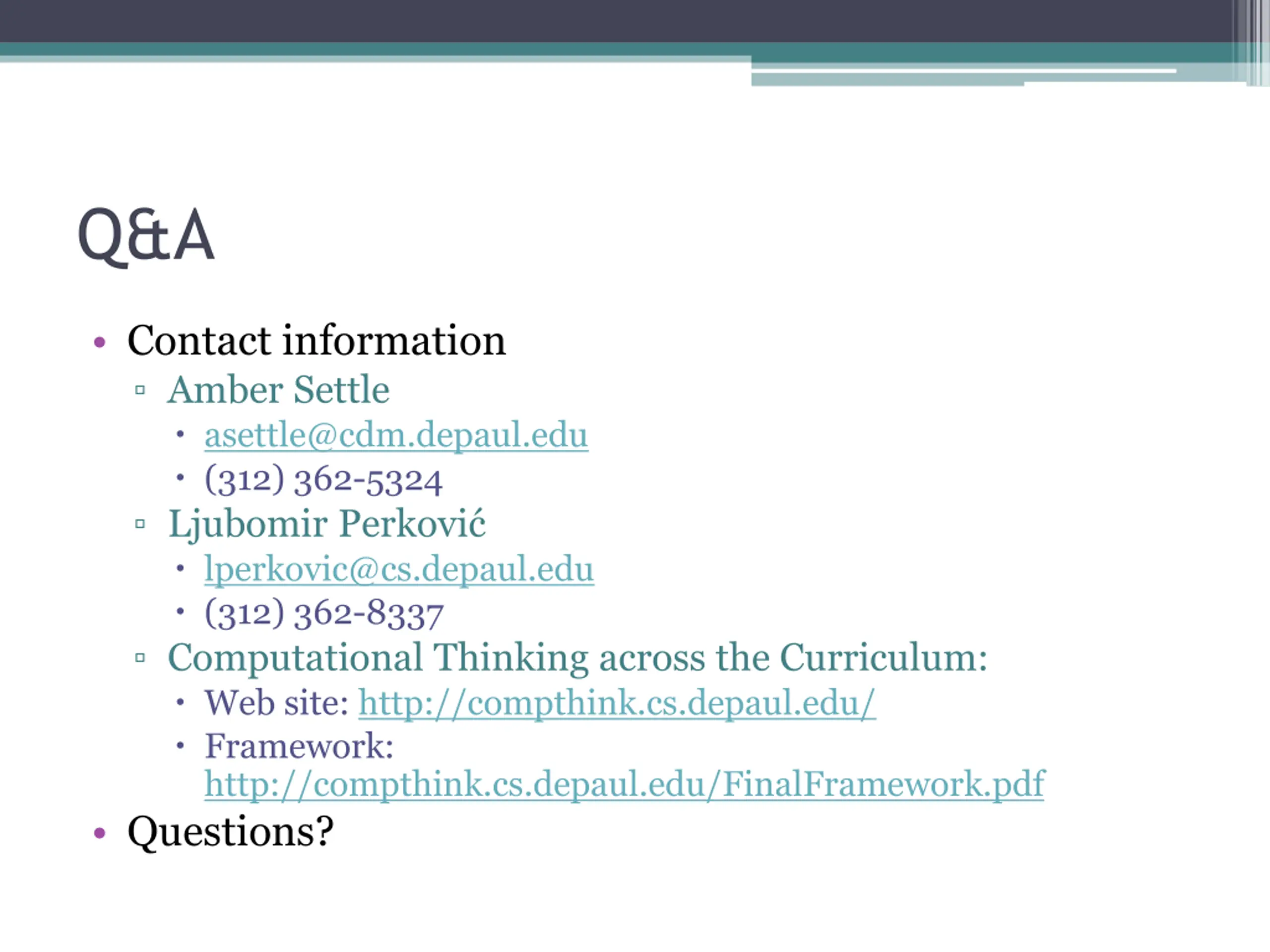 Q&A Contact information Amber Settle asettle@cdm.depaul.edu (312) 362-5324 Ljubomir Perkovi lperkovic@cs.depaul.edu (312) 362-8337 Computational Thinking across the Curriculum: Web site: http://compthink.cs.depaul.edu/ Framework: http://compthink.cs.depaul.edu/FinalFramework.pdf Questions?