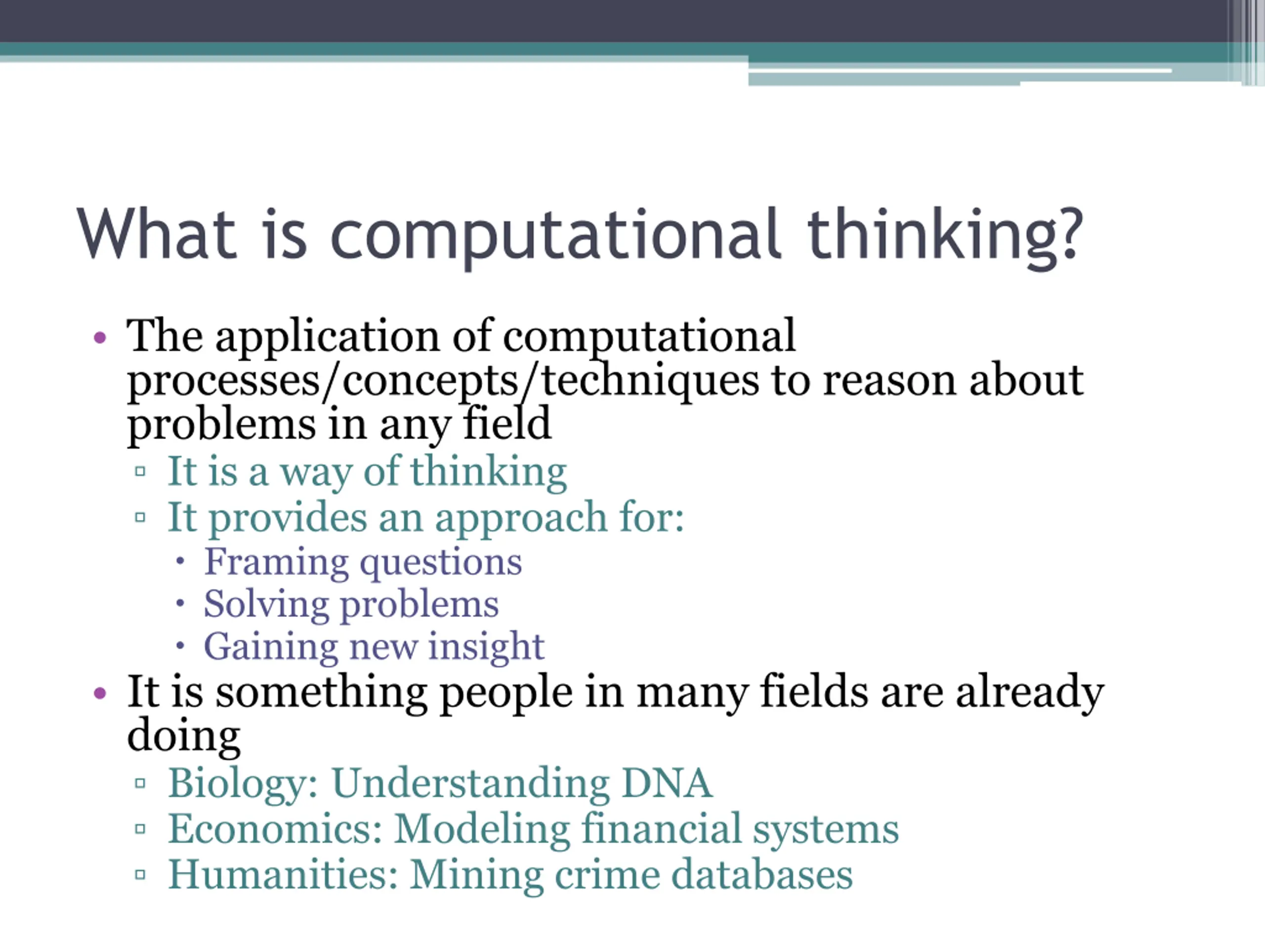 What is computational thinking? The application of computational processes/concepts/techniques to reason about problems in any field It is a way of thinking It provides an approach for: Framing questions Solving problems Gaining new insight It is something people in many fields are already doing Biology: Understanding DNA Economics: Modeling financial systems Humanities: Mining crime databases