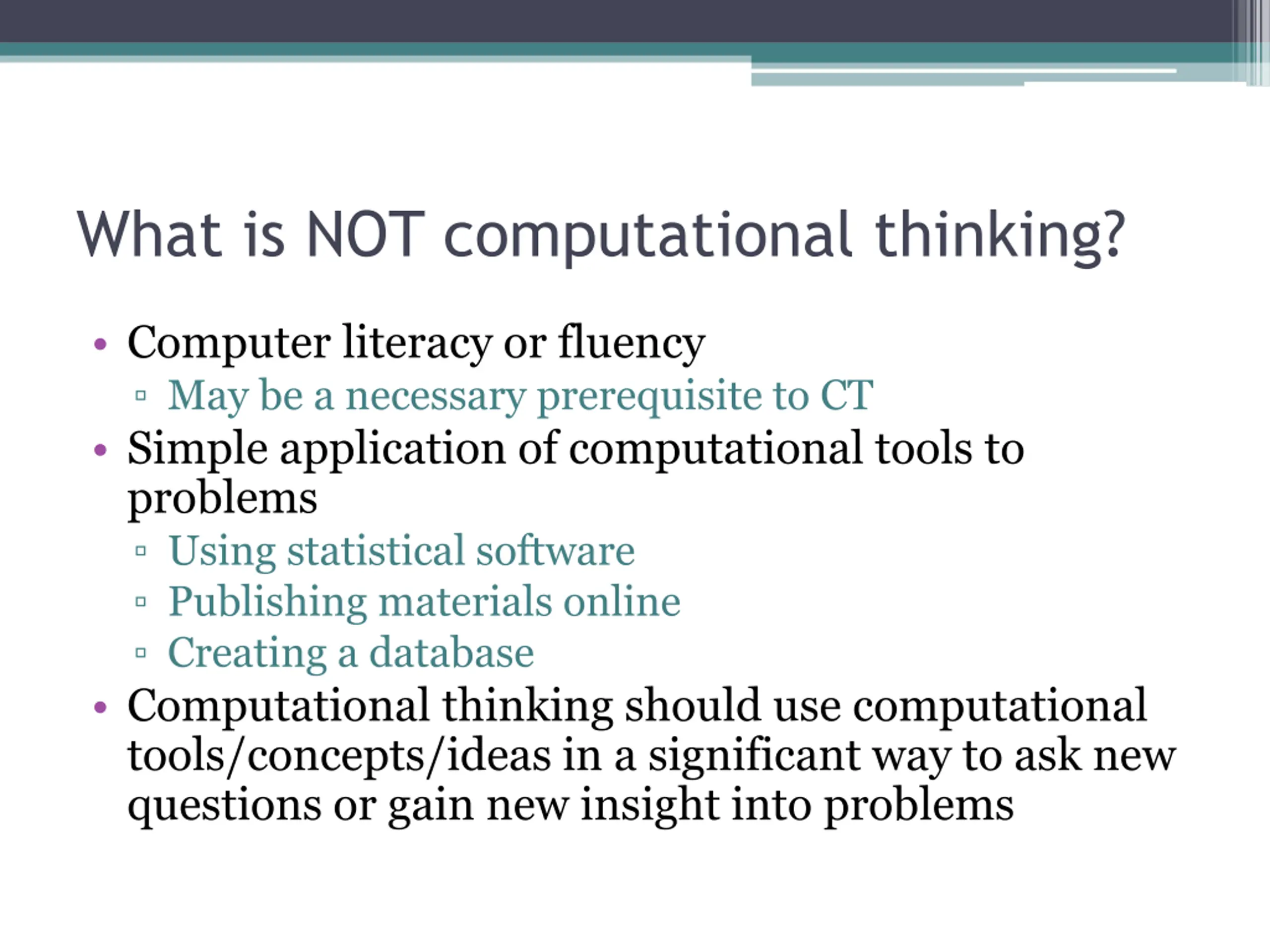 What is NOT computational thinking? Computer literacy or fluency May be a necessary prerequisite to CT Simple application of computational tools to problems Using statistical software Publishing materials online Creating a database Computational thinking should use computational tools/concepts/ideas in a significant way to ask new questions or gain new insight into problems