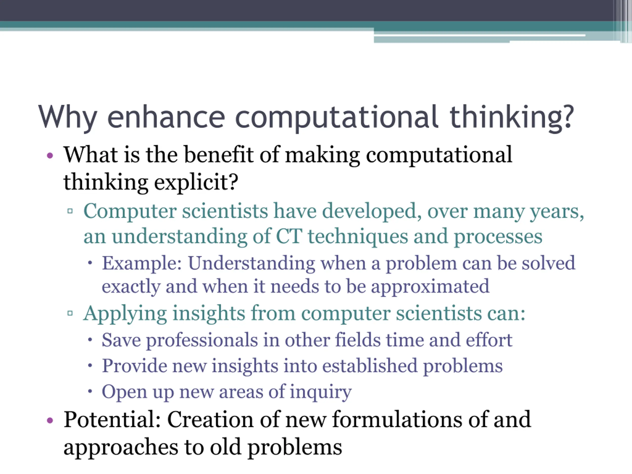 Why enhance computational thinking? What is the benefit of making computational thinking explicit? Computer scientists have developed, over many years, an understanding of CT techniques and processes Example: Understanding when a problem can be solved exactly and when it needs to be approximated Applying insights from computer scientists can: Save professionals in other fields time and effort Provide new insights into established problems Open up new areas of inquiry Potential: Creation of new formulations of and approaches to old problems