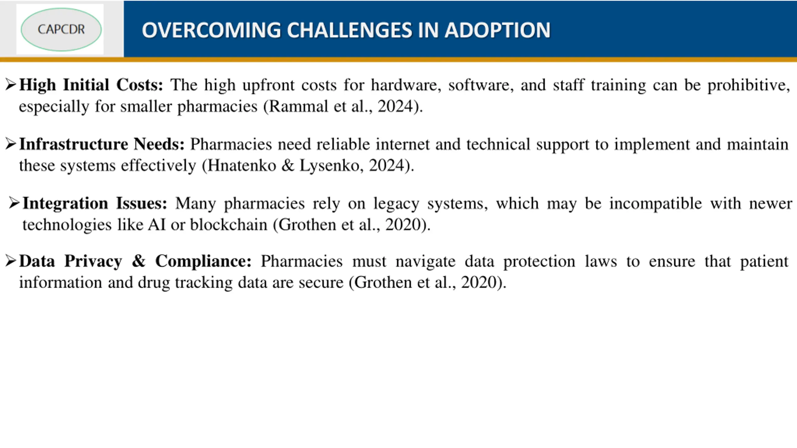 OVERCOMING CHALLENGES IN ADOPTION High Initial Costs: The high upfront costs for hardware, software, and staff training can be prohibitive, 5 especially for smaller pharmacies (Rammal et al., 2024). Infrastructure Needs: Pharmacies need reliable internet and technical support to implement and maintain these systems effectively (Hnatenko & Lysenko, 2024). Integration Issues: Many pharmacies rely on legacy systems, which may be incompatible with newer technologies like AI or blockchain (Grothen et al., 2020). Data Privacy & Compliance: Pharmacies must navigate data protection laws to ensure that patient information and drug tracking data are secure (Grothen et al., 2020).