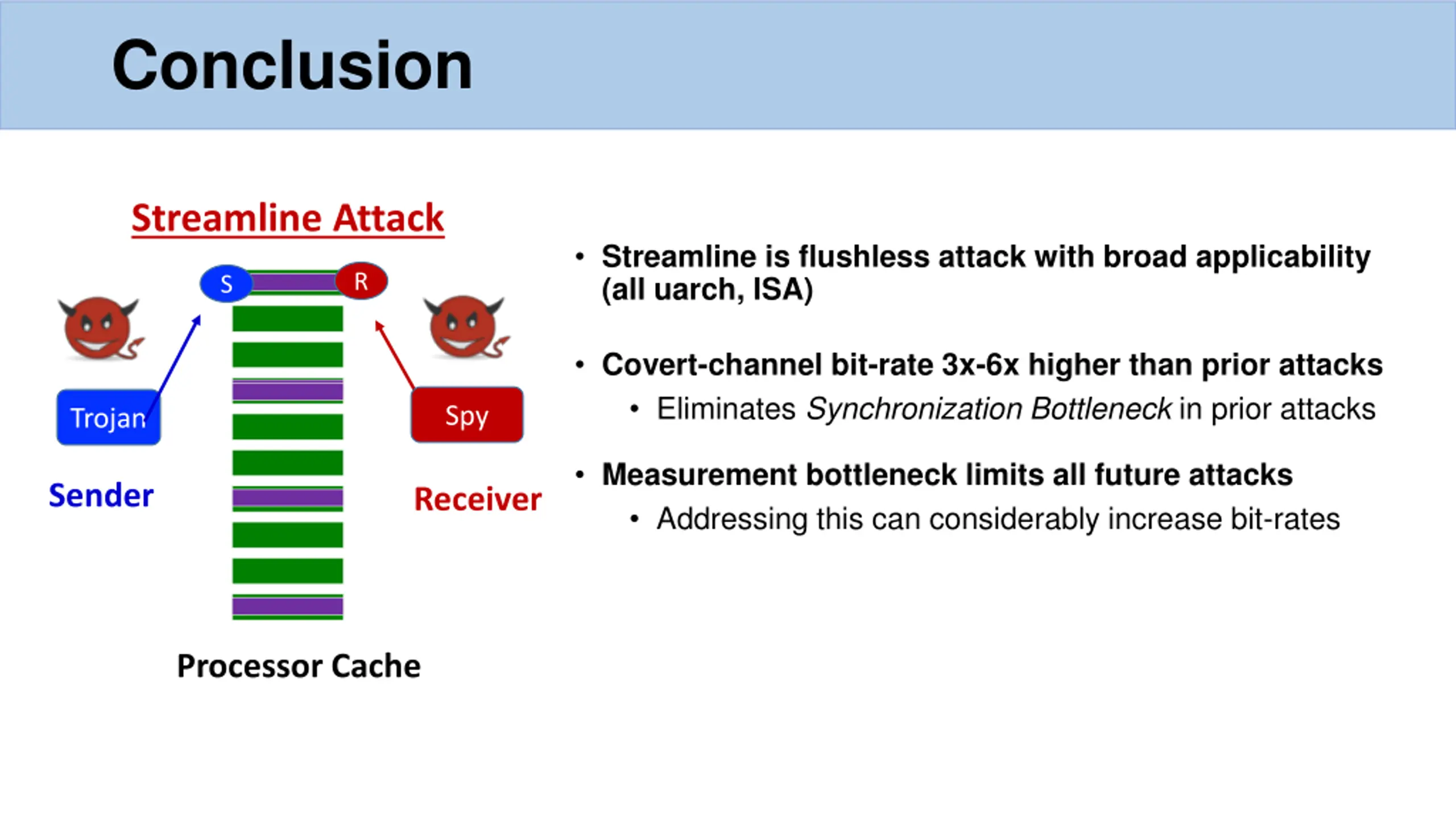 Conclusion Streamline Attack Streamline is flushless attack with broad applicability (all uarch, ISA) R S Covert-channel bit-rate 3x-6x higher than prior attacks Eliminates Synchronization Bottleneck in prior attacks Spy Trojan Measurement bottleneck limits all future attacks Addressing this can considerably increase bit-rates Sender Receiver Processor Cache