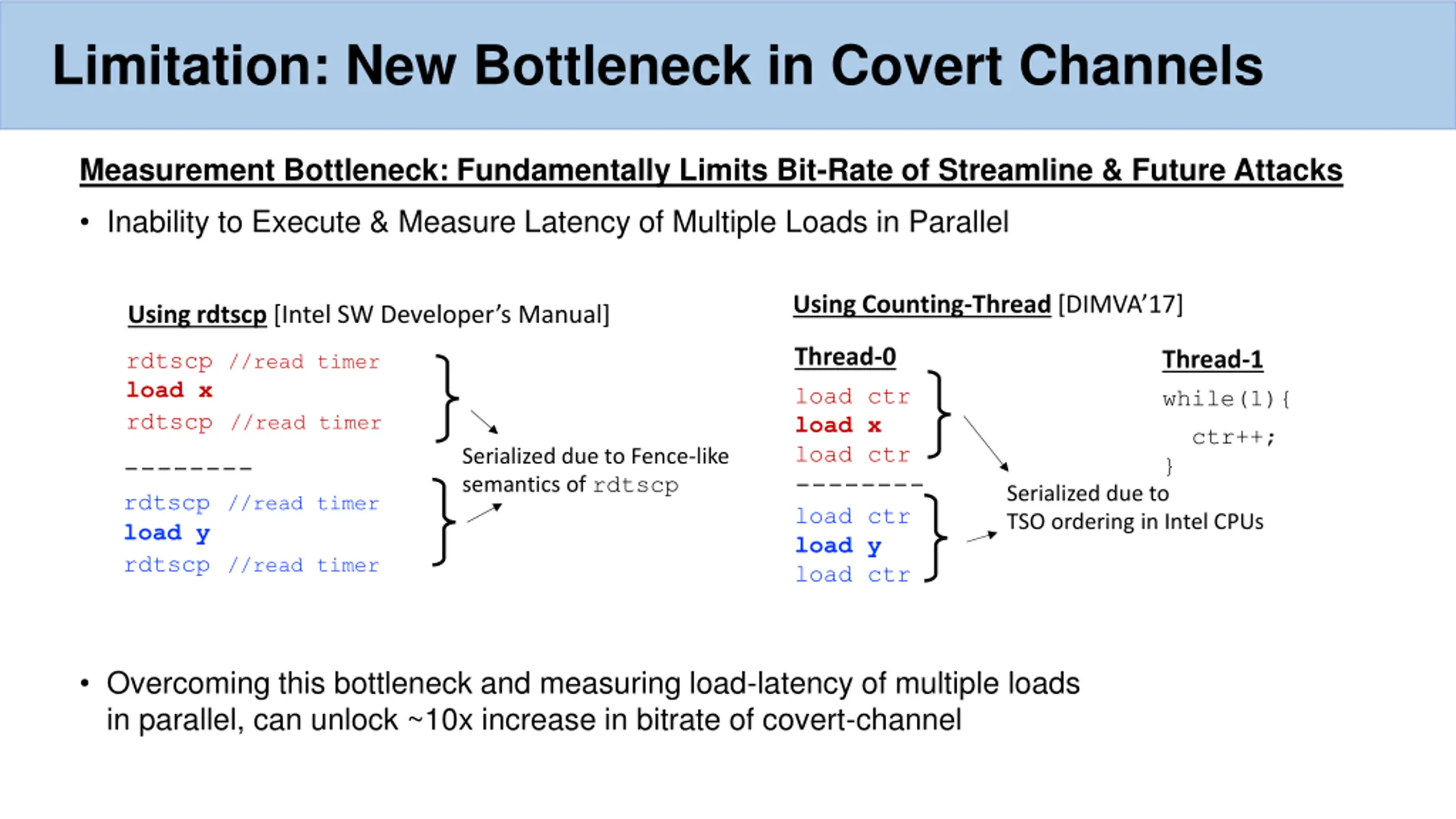 Limitation: New Bottleneck in Covert Channels Measurement Bottleneck: Fundamentally Limits Bit-Rate of Streamline & Future Attacks Inability to Execute & Measure Latency of Multiple Loads in Parallel Using Counting-Thread [DIMVA 17] Using rdtscp [Intel SW Developer s Manual] Thread-0 load ctr load x load ctr -------- load ctr load y load ctr Thread-1 while(1){ ctr++; } rdtscp //read timer load x rdtscp//read timer Serialized due to Fence-like semantics of rdtscp -------- rdtscp//read timer load y rdtscp//read timer Serialized due to TSO ordering in Intel CPUs Overcoming this bottleneck and measuring load-latency of multiple loads in parallel, can unlock ~10x increase in bitrate of covert-channel