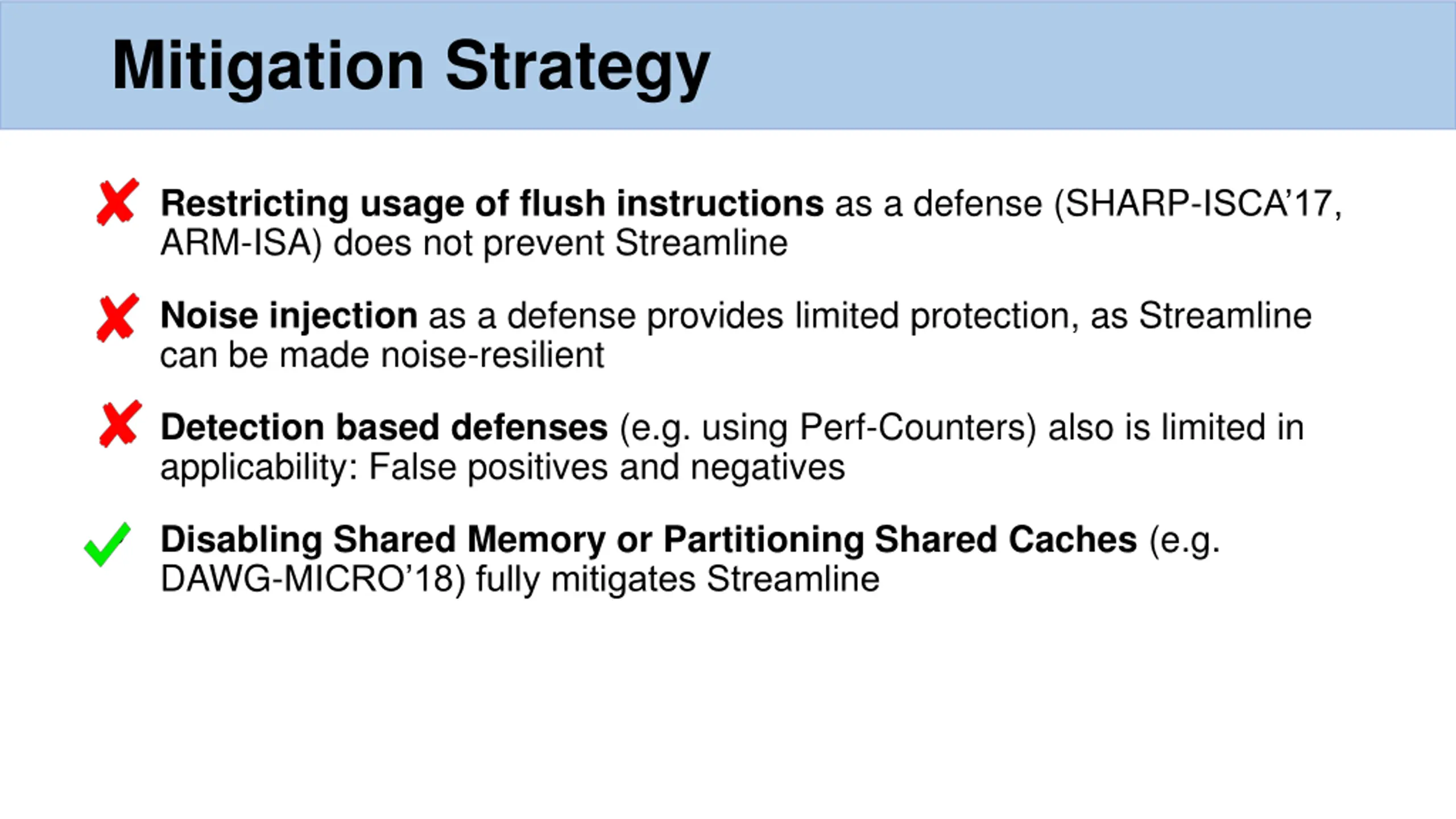 Mitigation Strategy Restricting usage of flush instructions as a defense (SHARP-ISCA 17, ARM-ISA) does not prevent Streamline Noise injection as a defense provides limited protection, as Streamline can be made noise-resilient Detection based defenses (e.g. using Perf-Counters) also is limited in applicability: False positives and negatives Disabling Shared Memory or Partitioning Shared Caches (e.g. DAWG-MICRO 18) fully mitigates Streamline