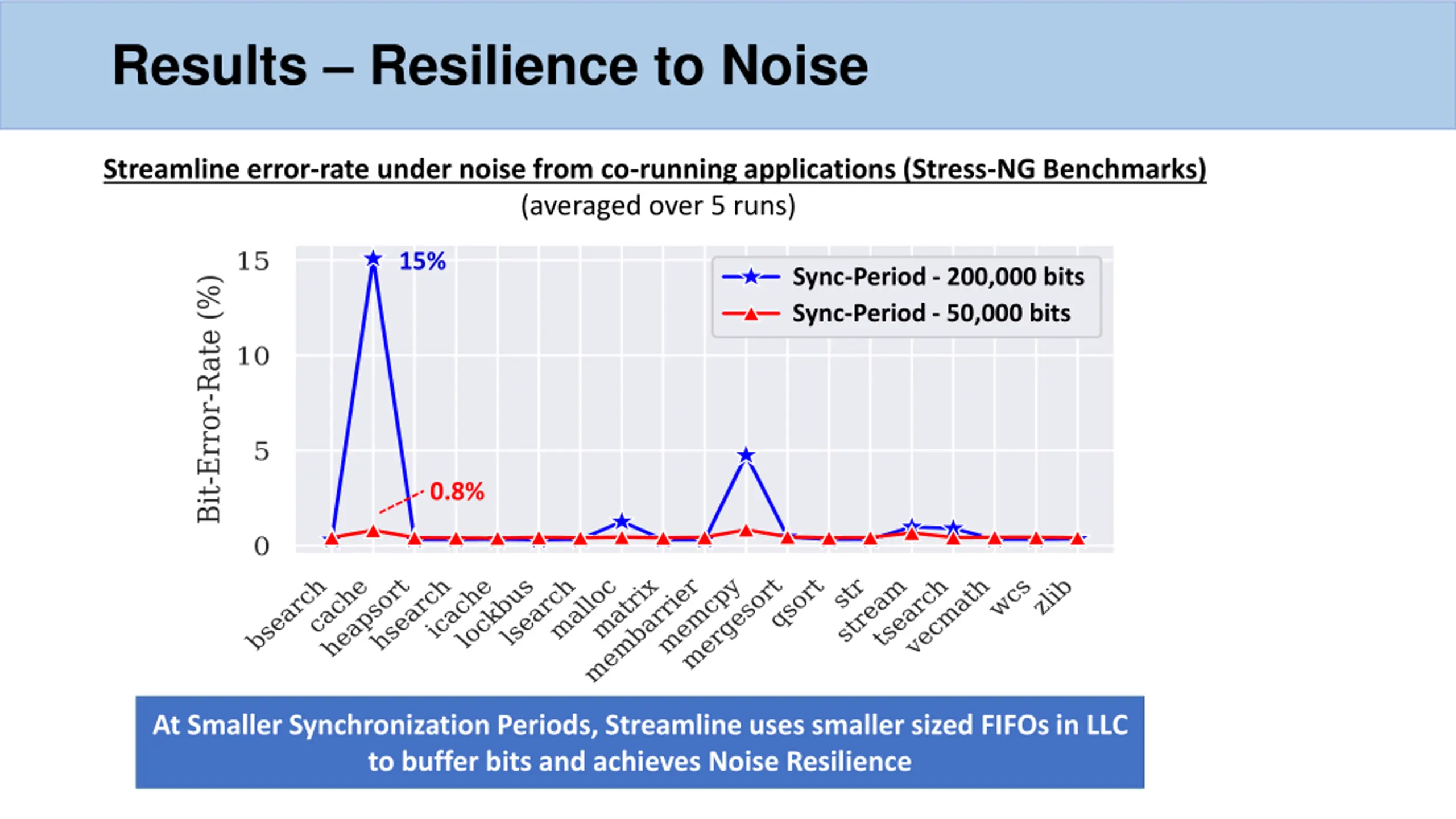 Results Resilience to Noise Streamline error-rate under noise from co-running applications (Stress-NG Benchmarks) (averaged over 5 runs) 15% Sync-Period - 200,000 bits Sync-Period - 50,000 bits 0.8% At Smaller Synchronization Periods, Streamline uses smaller sized FIFOs in LLC to buffer bits and achieves Noise Resilience